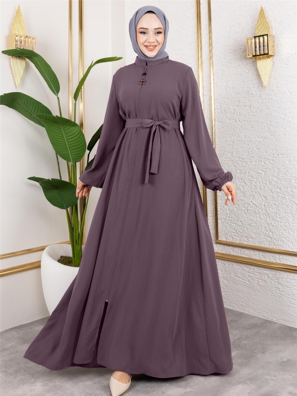 Boydan Fermuarlı Kolu Lastikli Beli Kemerli Ferace -Vişne (197-3851-R44)