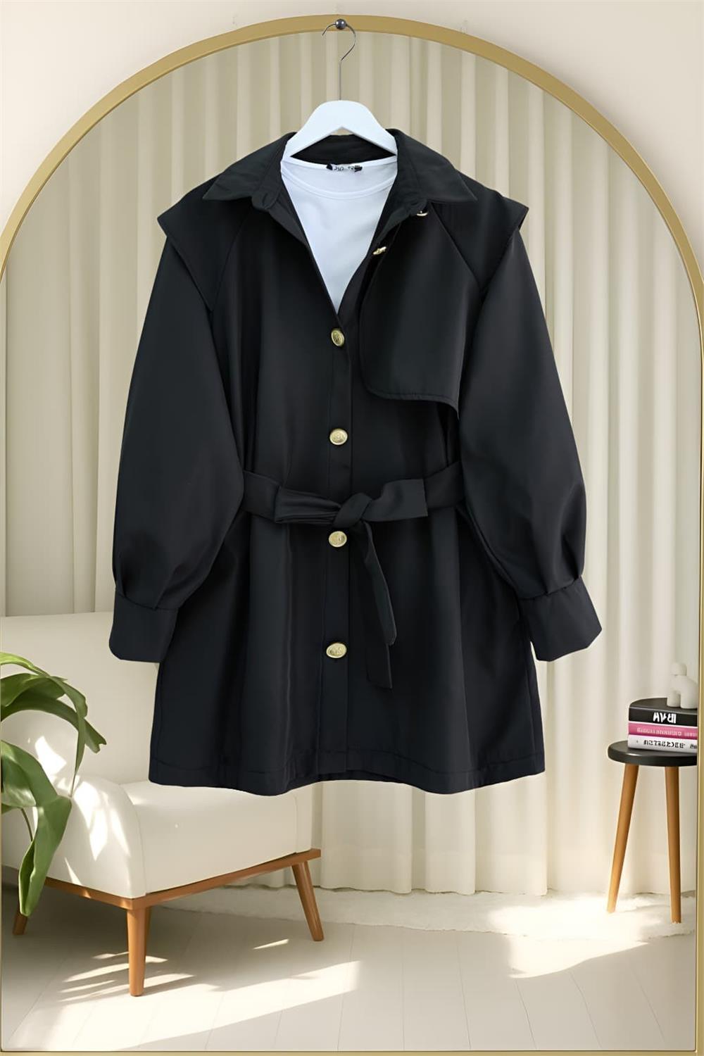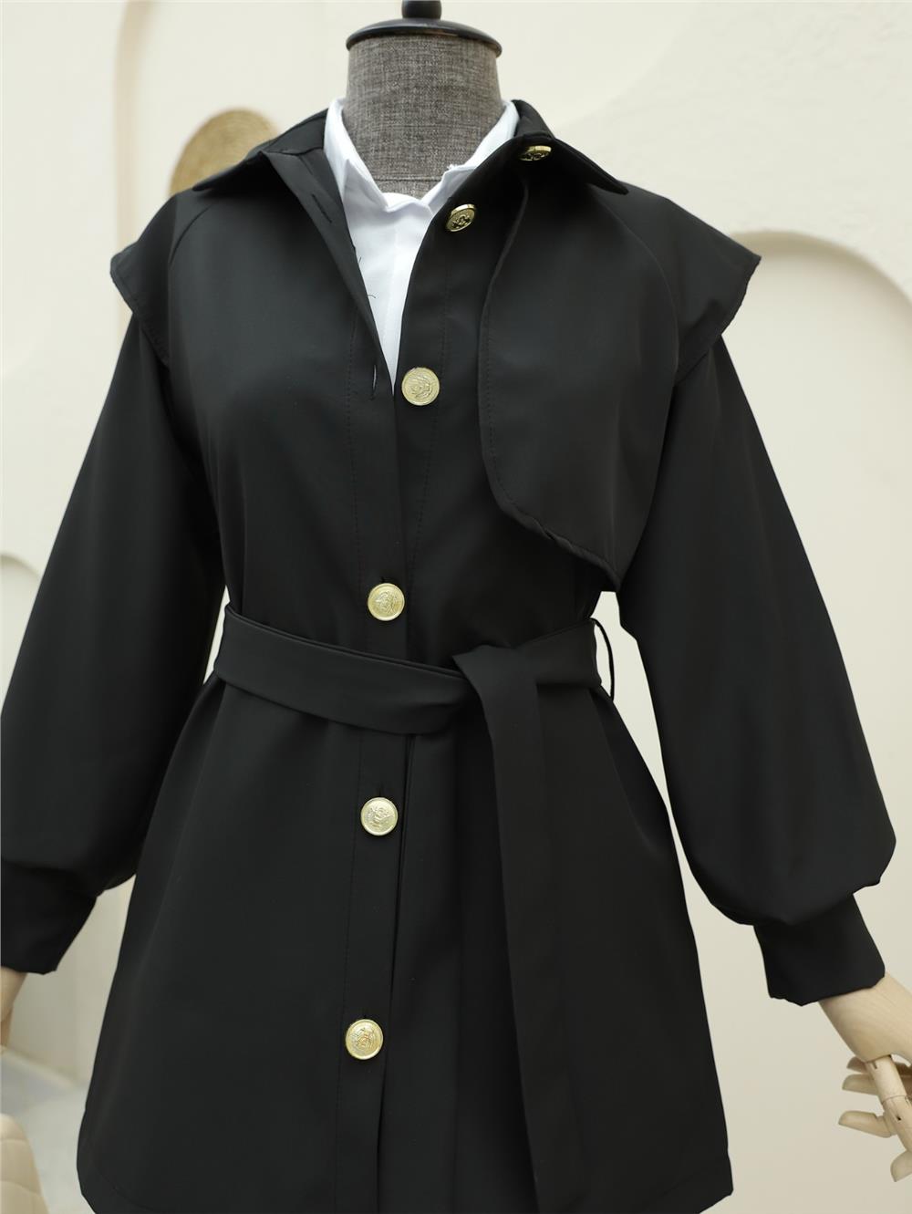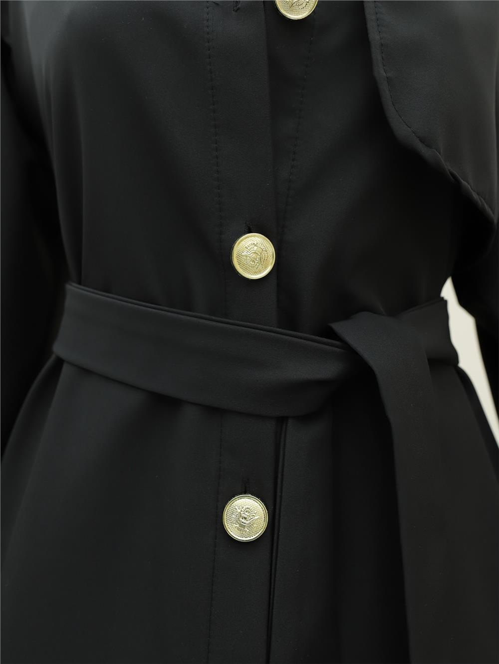 Broş Düğmeli Çift Düğmeli Kemerli Trençkot -Siyah (120-1589-R01)