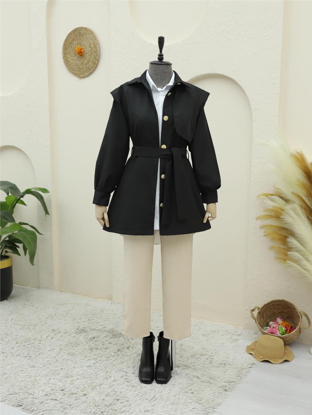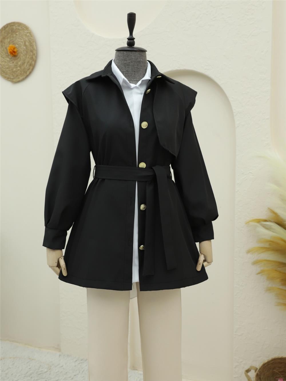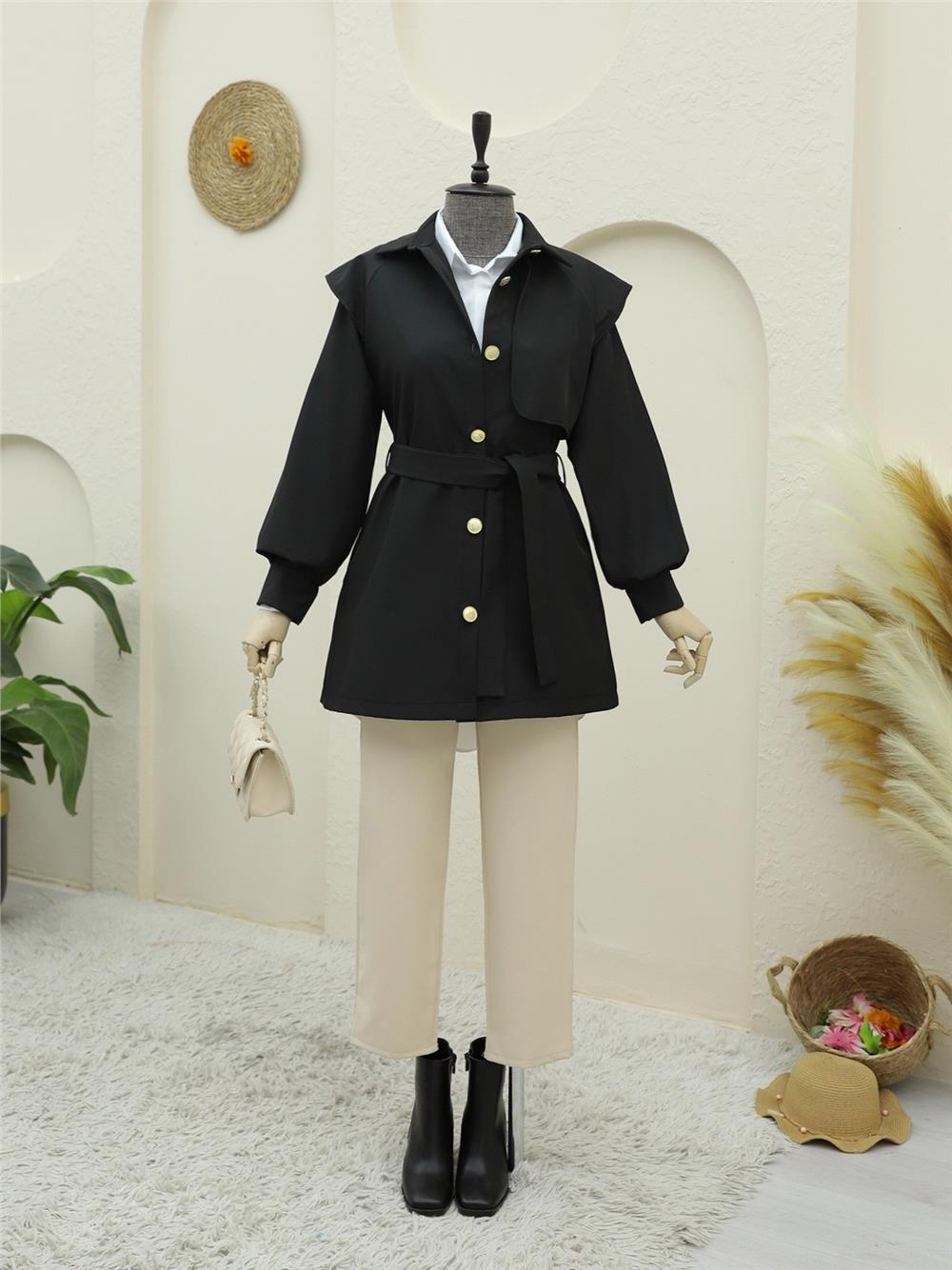 Broş Düğmeli Çift Düğmeli Kemerli Trençkot -Siyah (120-1589-R01)