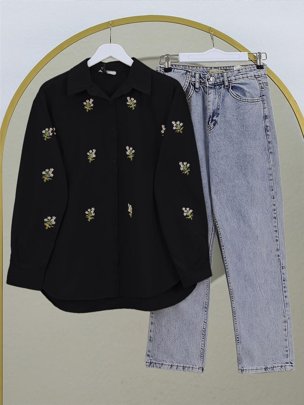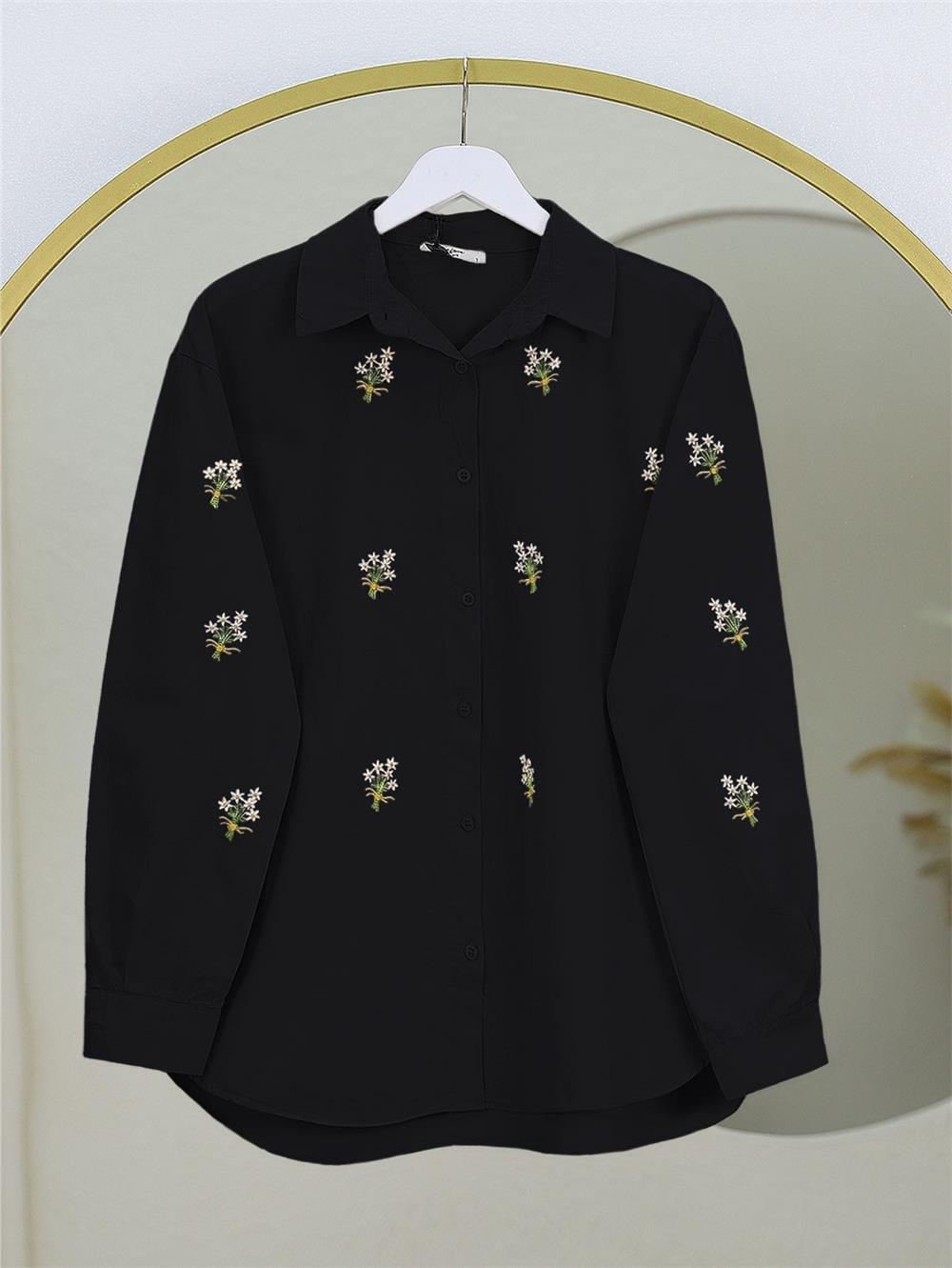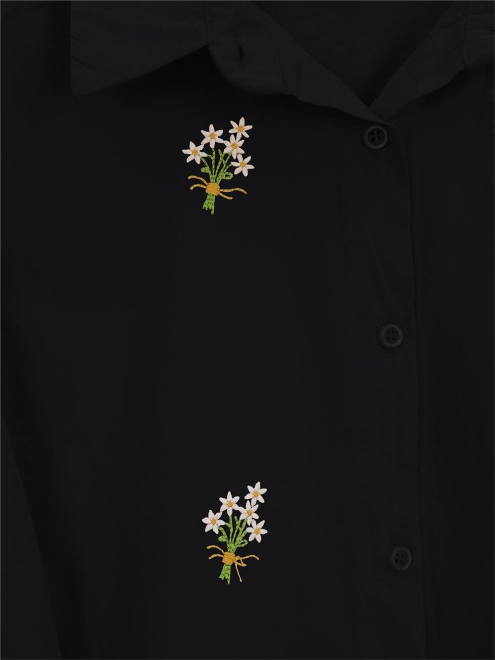 Buket Çiçek Detaylı Arkası Uzun Gömlek -Siyah (403-10054-R01)