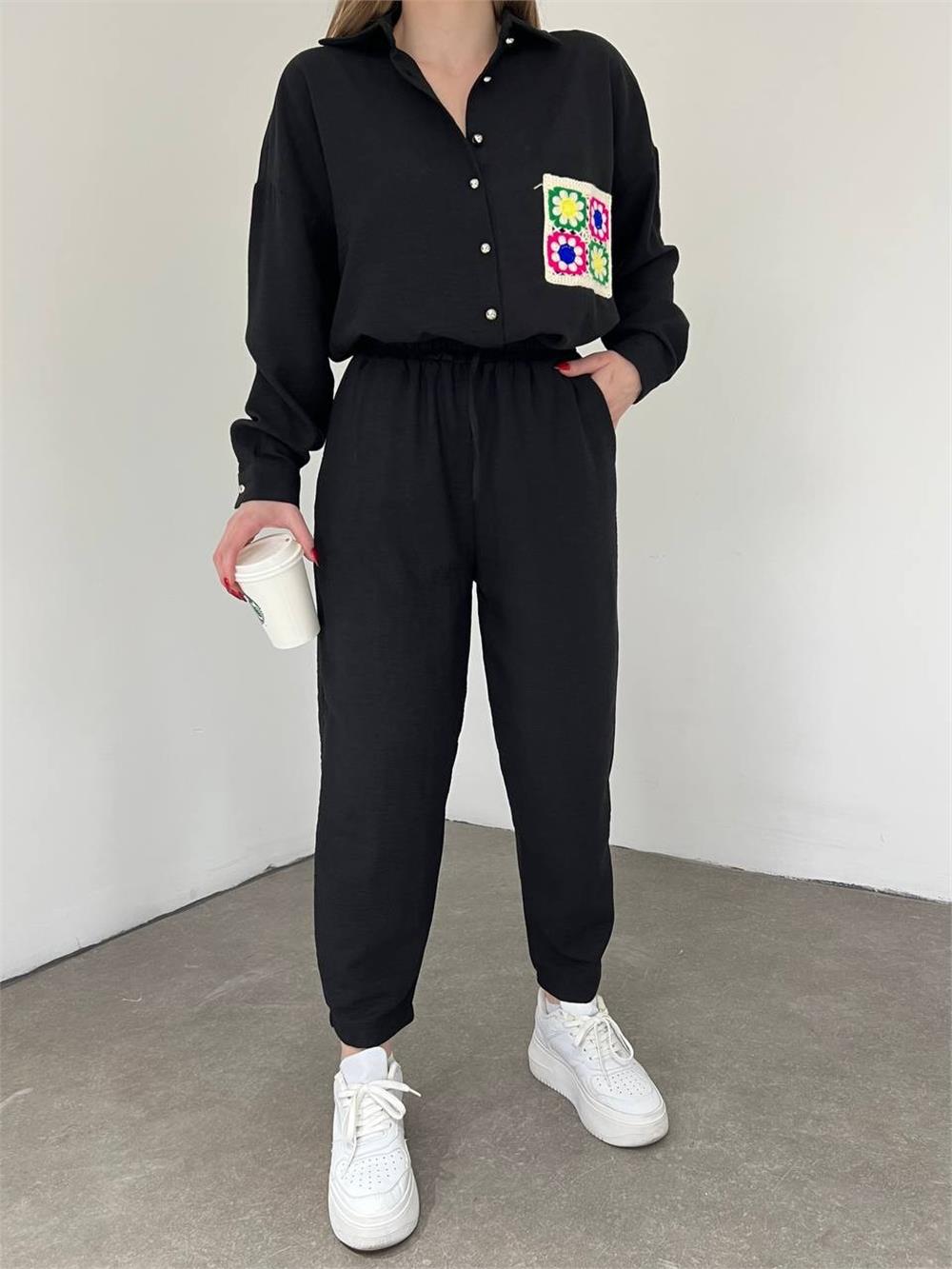Double Linen Suit with Colorful Lace Pockets - Black (358-10452-R01)