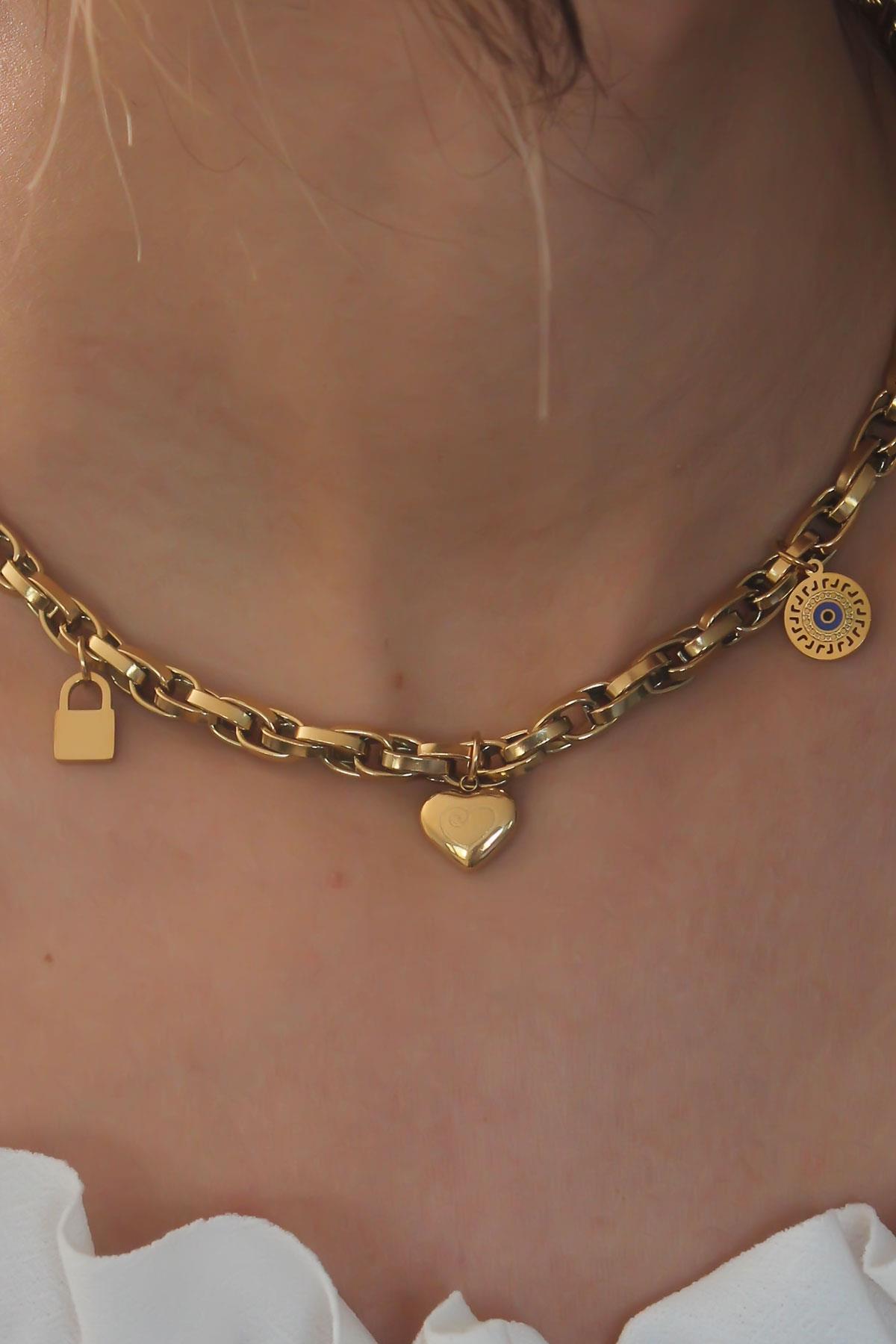 Çelik Gold Renk Kalın Zincir Model Kalp Figür Kadın Kolye (BKO6898)