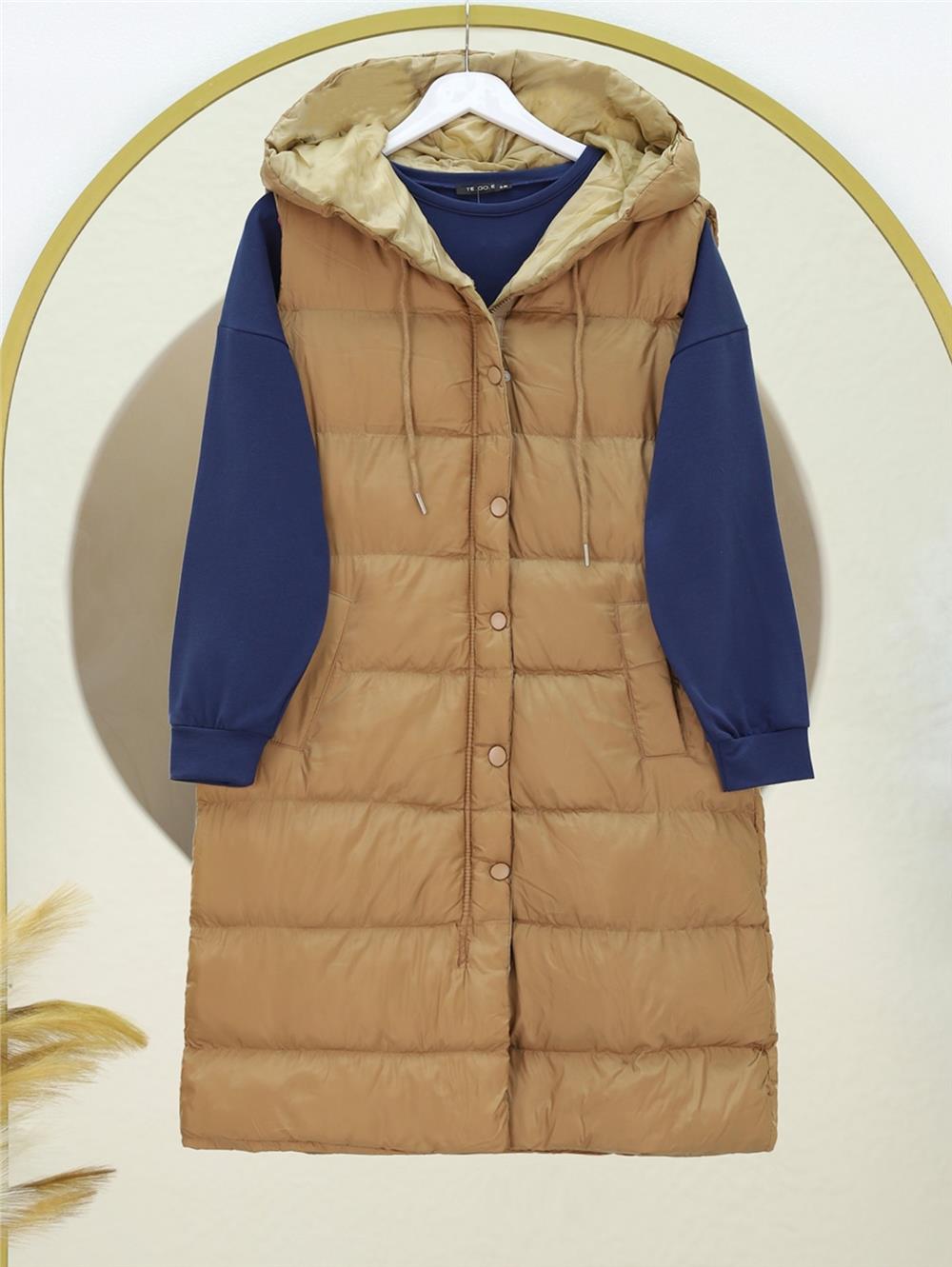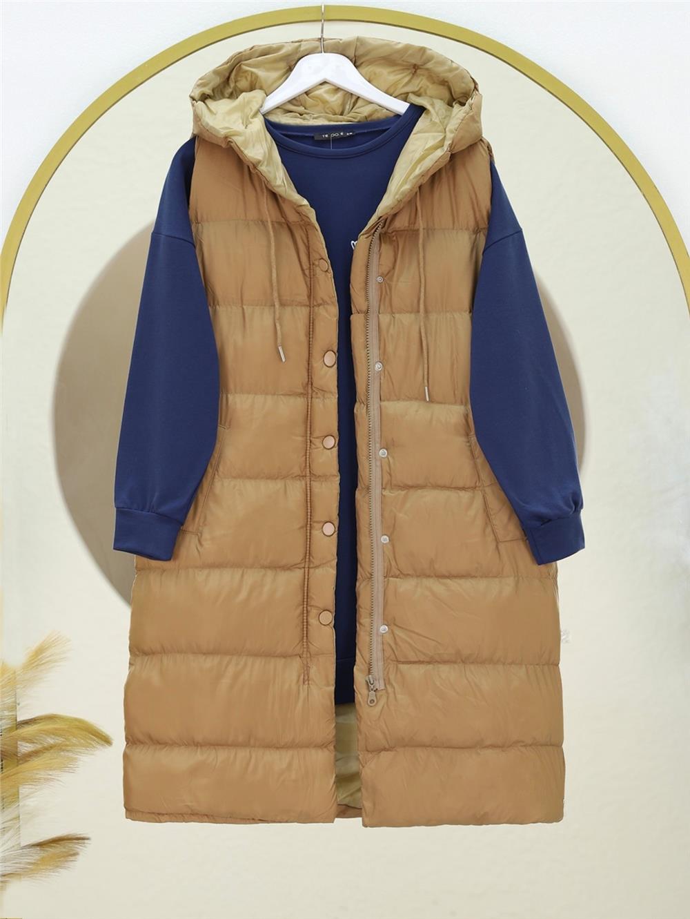 Cepli Fermuarlı Kapşonlu Şişme Yelek -Vizon (332-70040-R23)