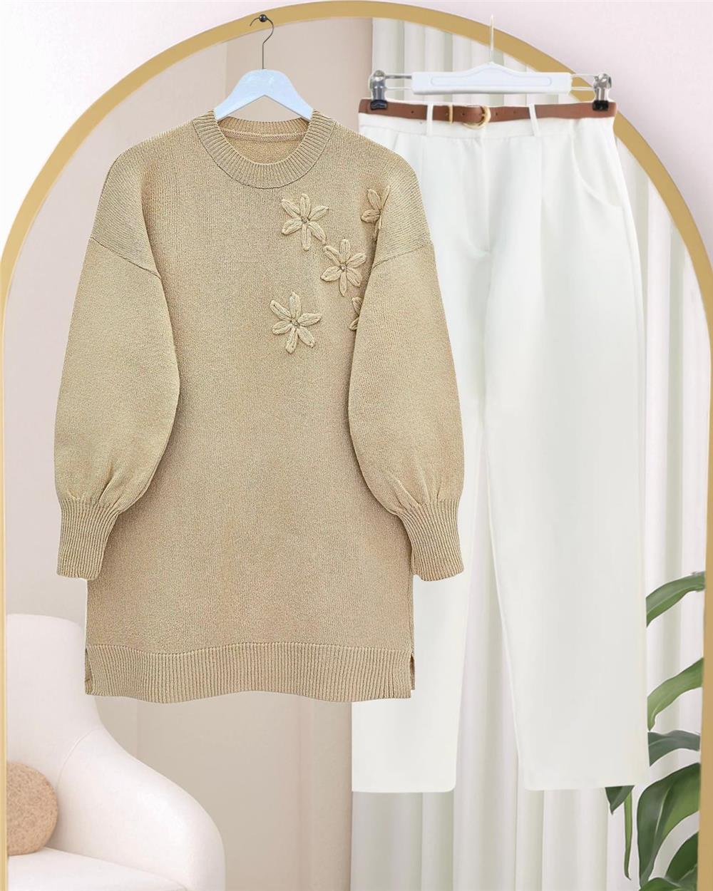 Çiçek Desenli Taşlı Yumoş Triko Kazak -Açık Vizon (295-4515-R51)