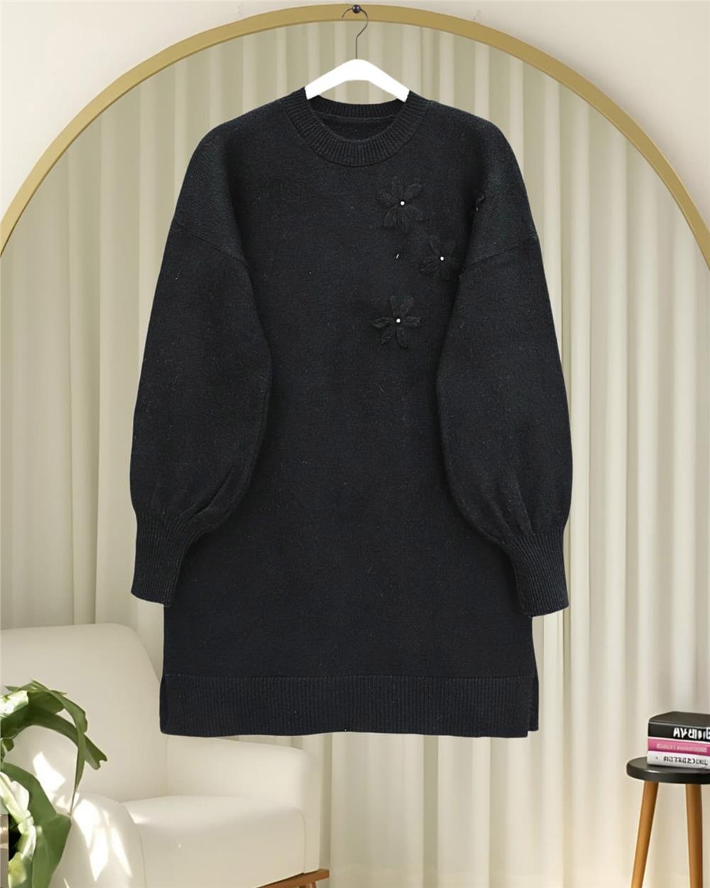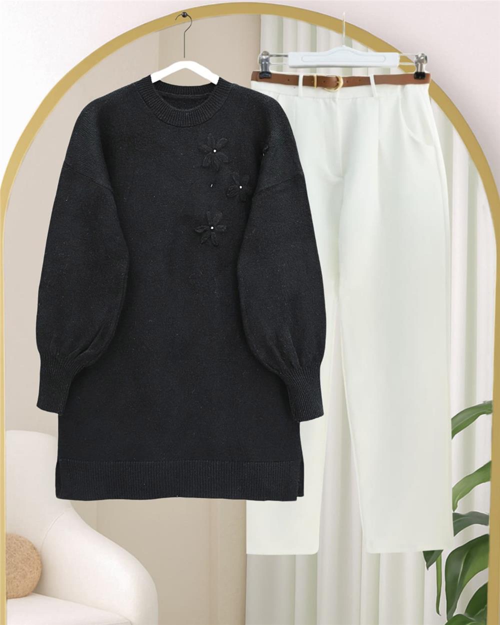 Çiçek Desenli Taşlı Yumoş Triko Kazak -Siyah (295-4515-R01)