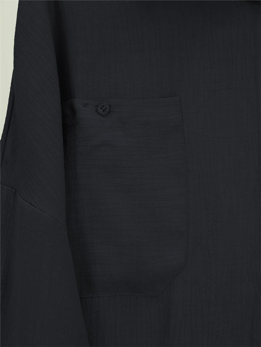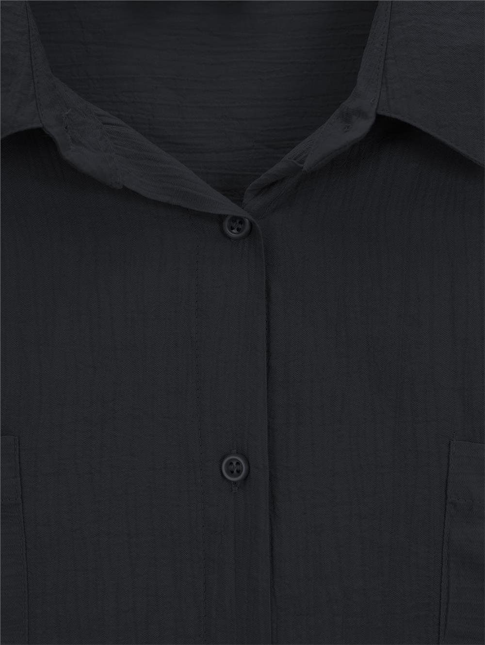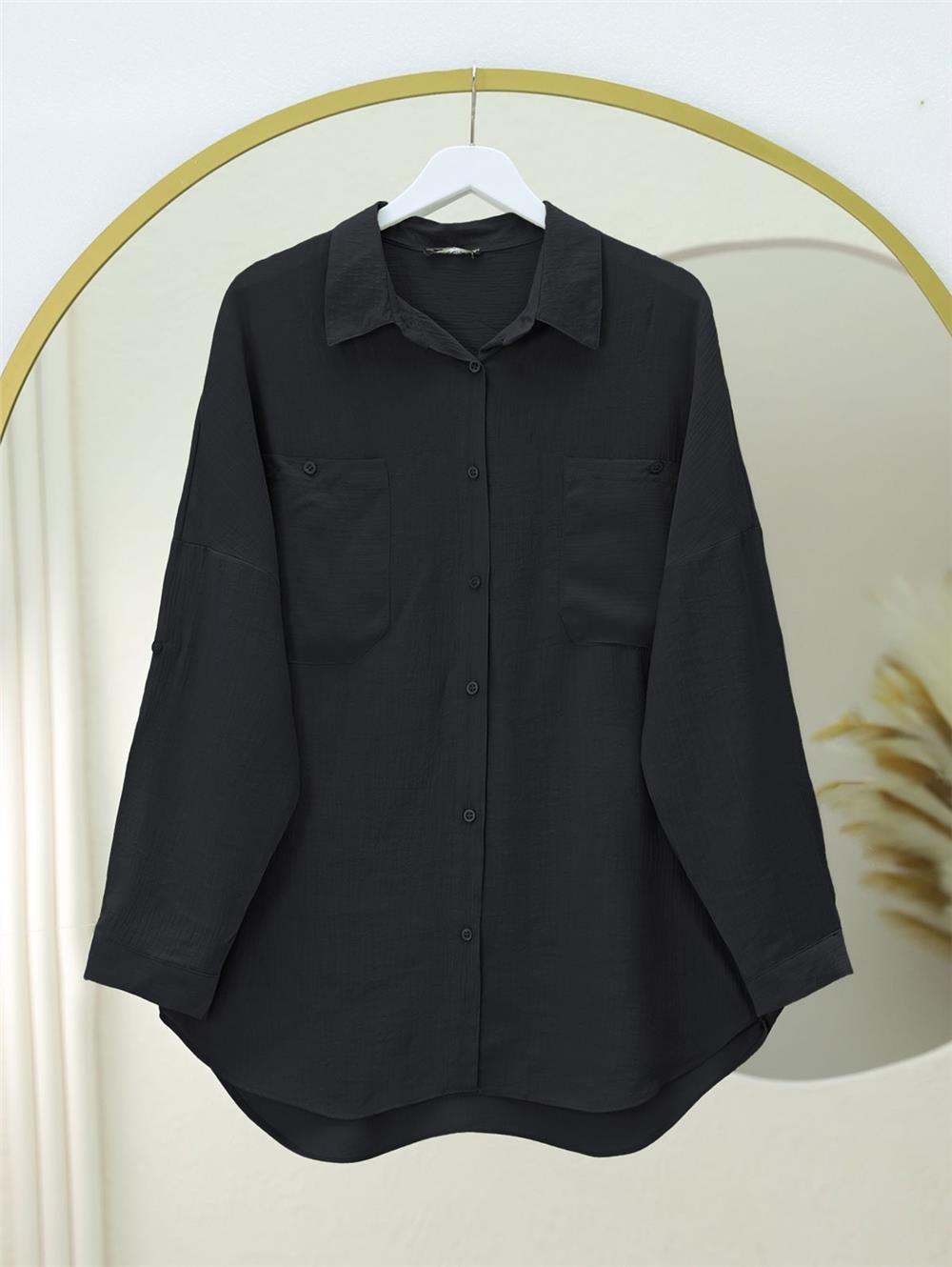 Çift Cepli Oval Kesim Kolu Katlamalı Gömlek Tunik -Siyah (317-2420-R01)