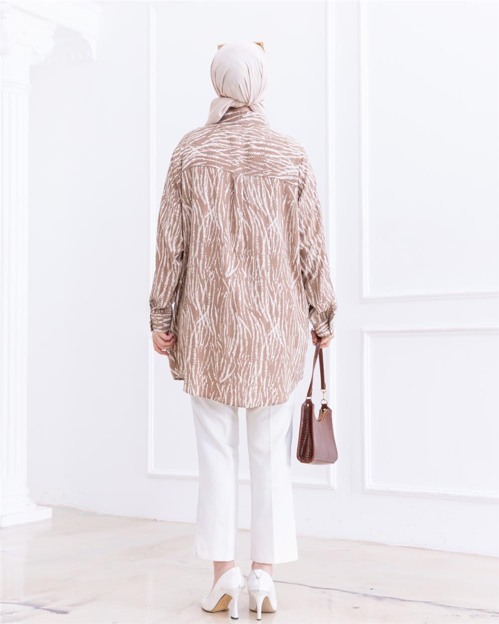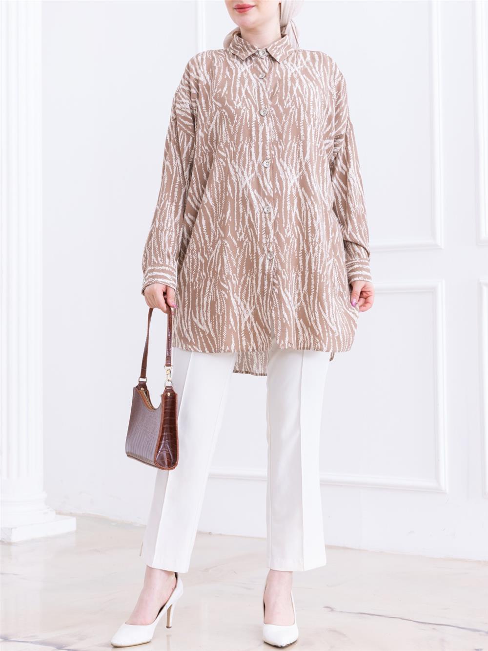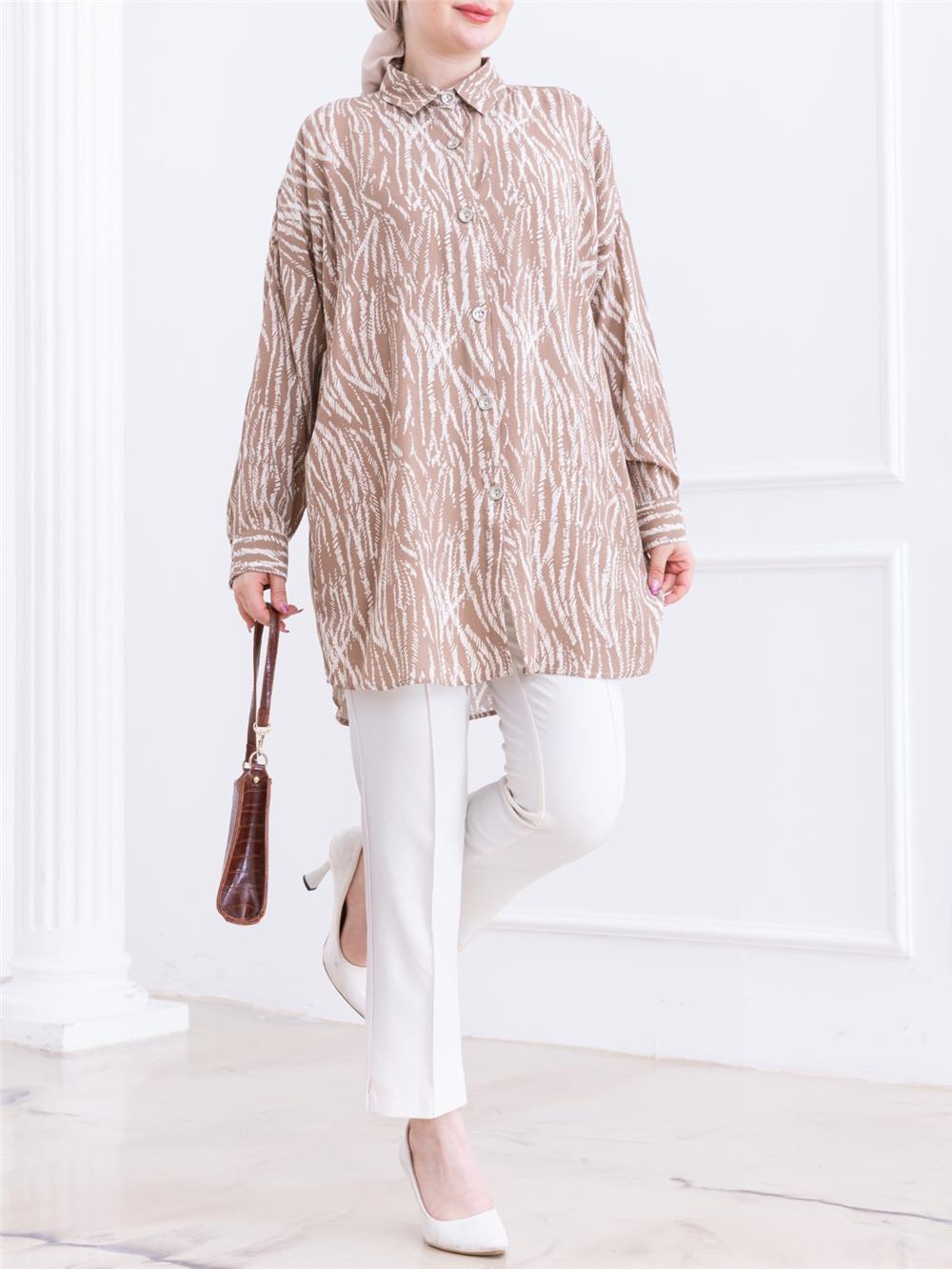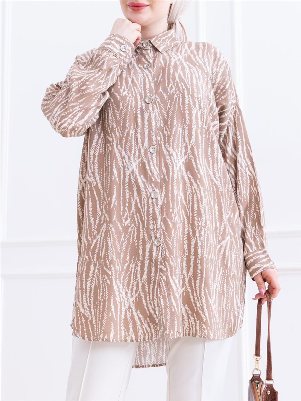 Çizgi Desenli Boydan Düğmeli Viskon Tunik -Vizon (199-2041-R23)