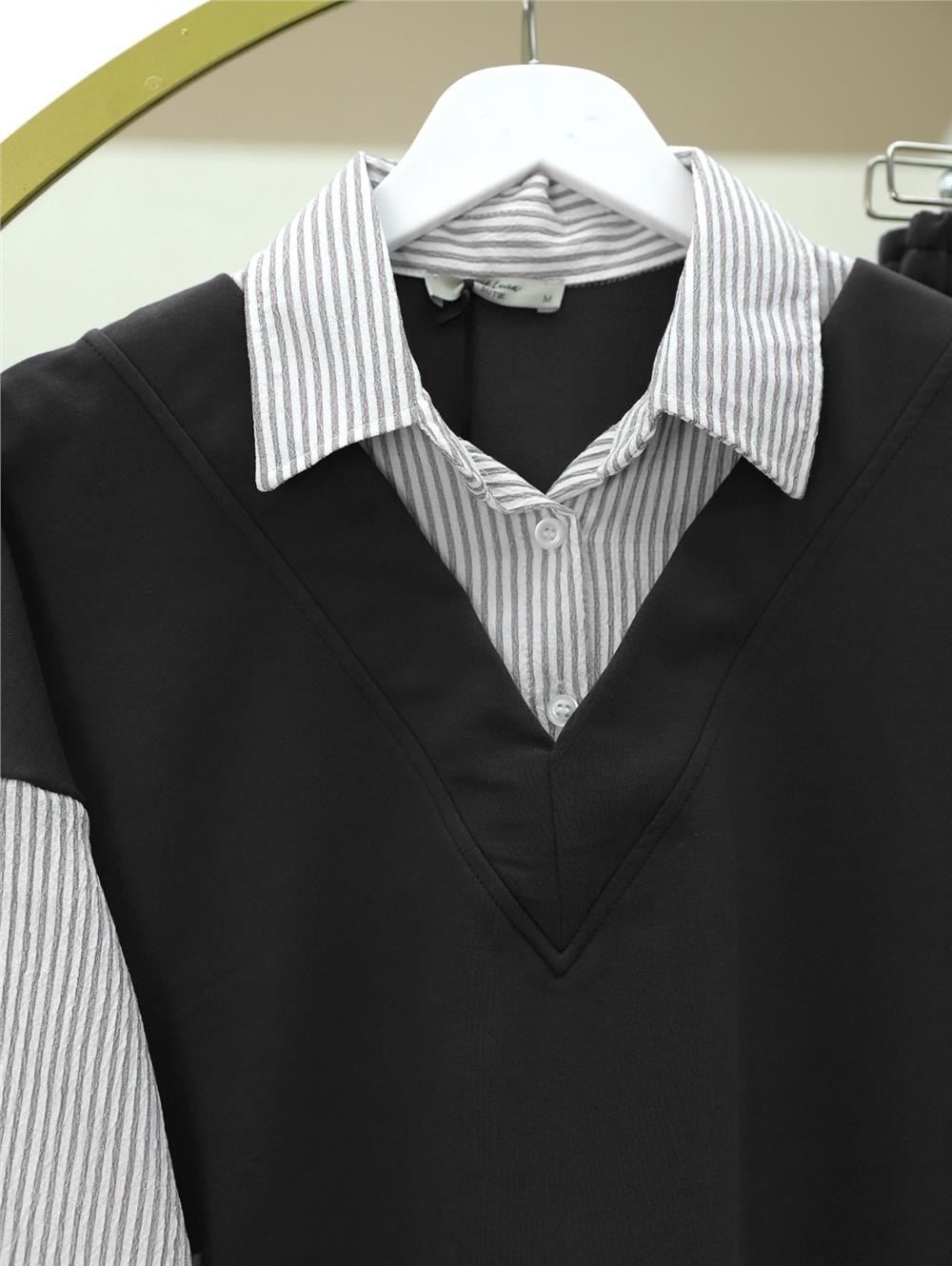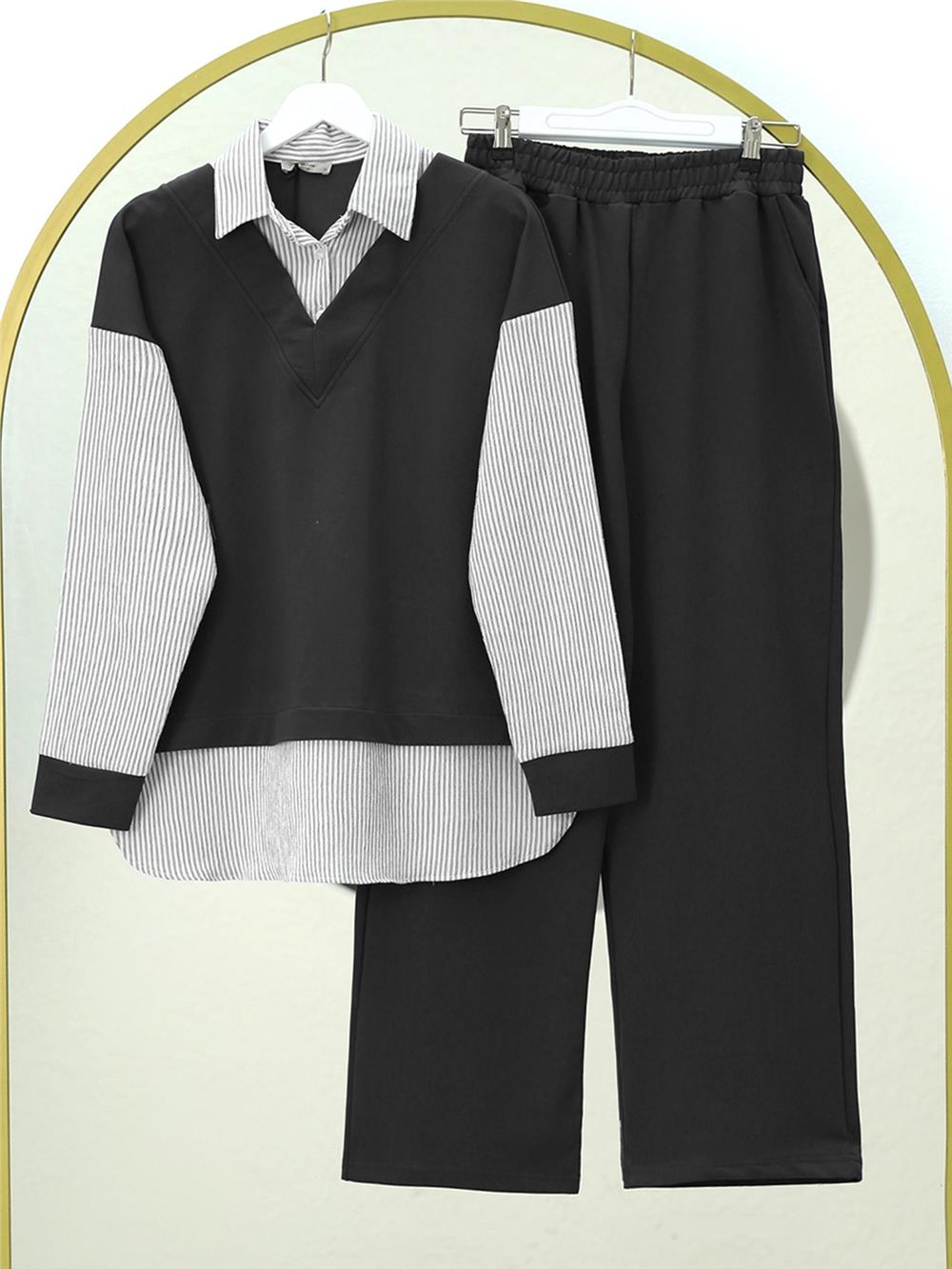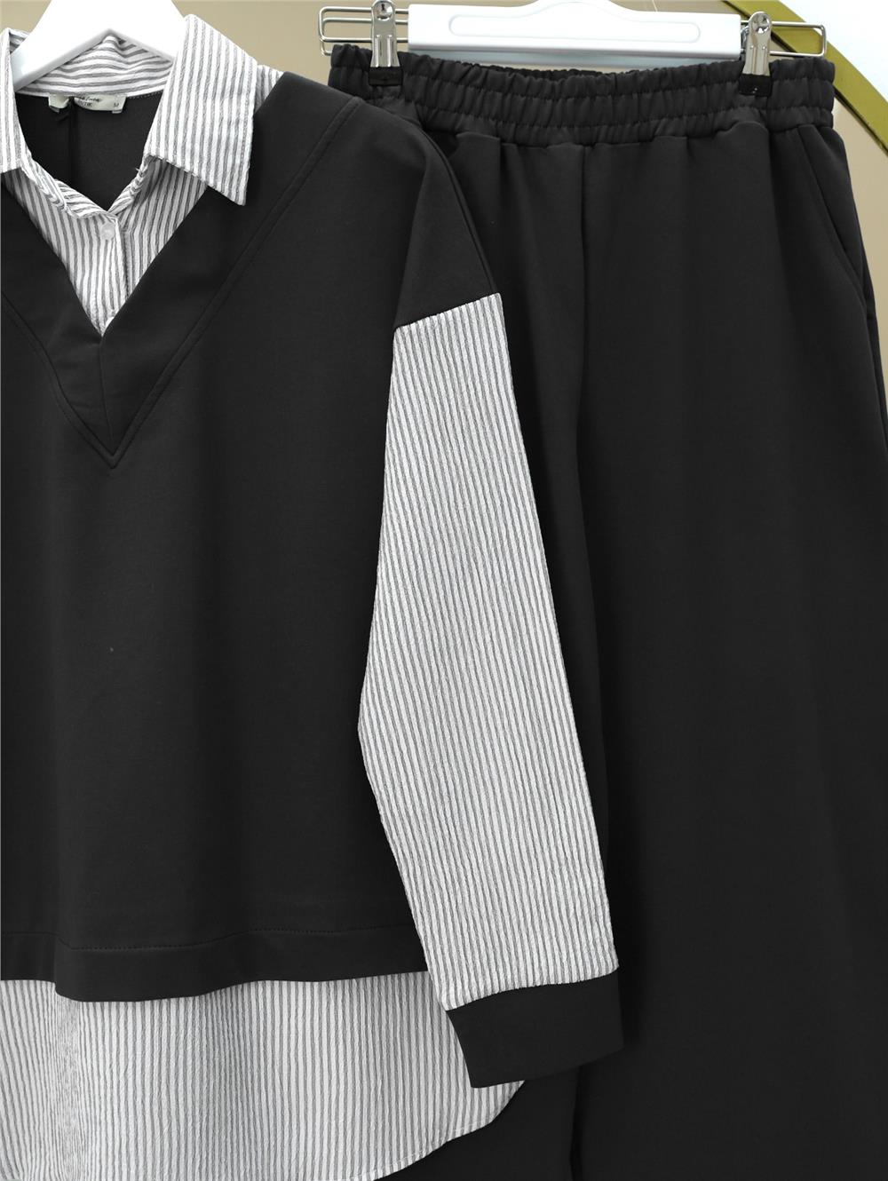 Çizgili Gömlek Detaylı V Yaka Takım -Siyah (403-2017-R01)