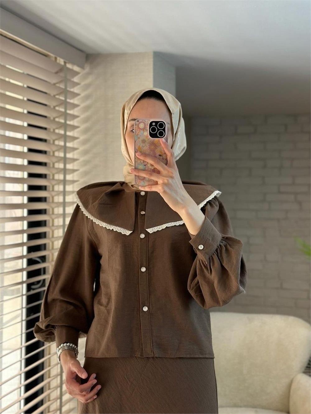 Lace Lettuce Collar Pure Linen Skirt Suit - Brown (307-2082-R15)