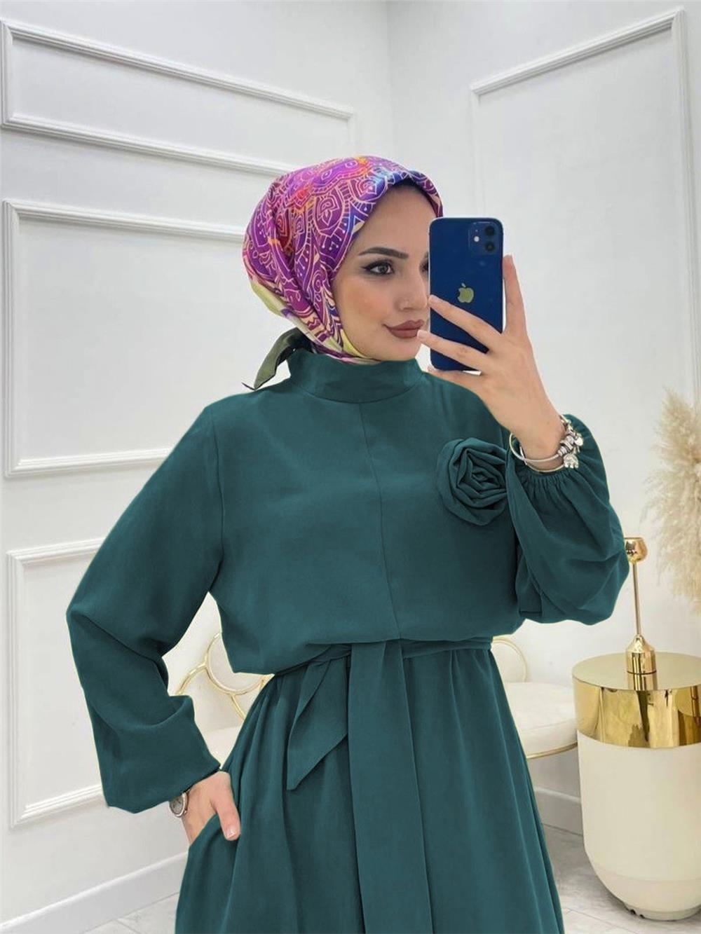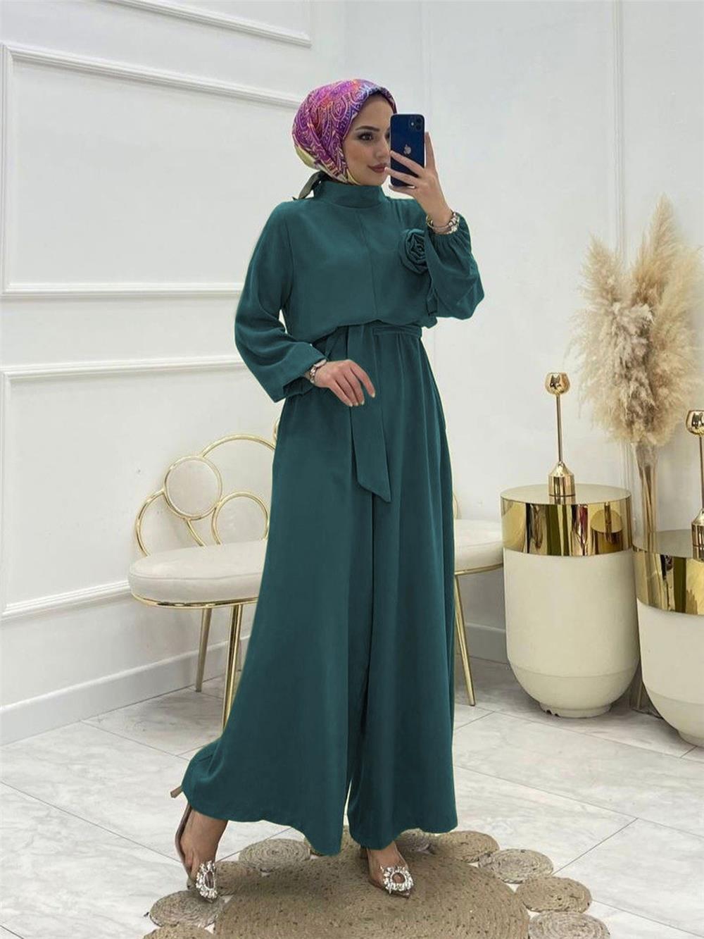 Dik Yaka Kemerli Güllü Tulum -Petrol (319-8009-R29)