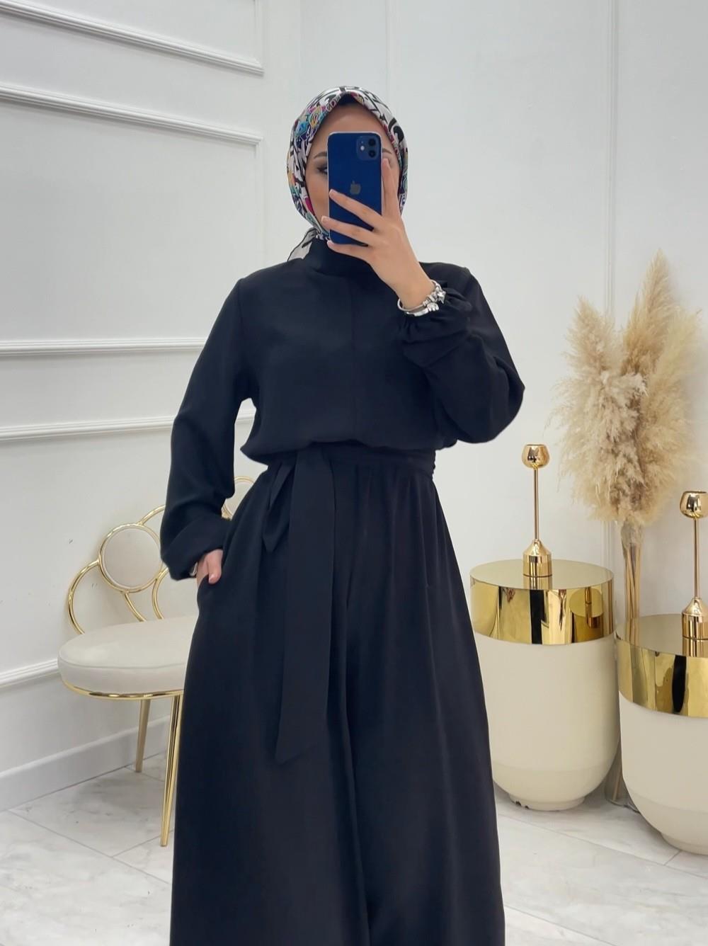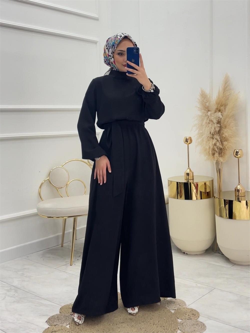 Dik Yaka Kemerli Güllü Tulum -Siyah (319-8009-R01)