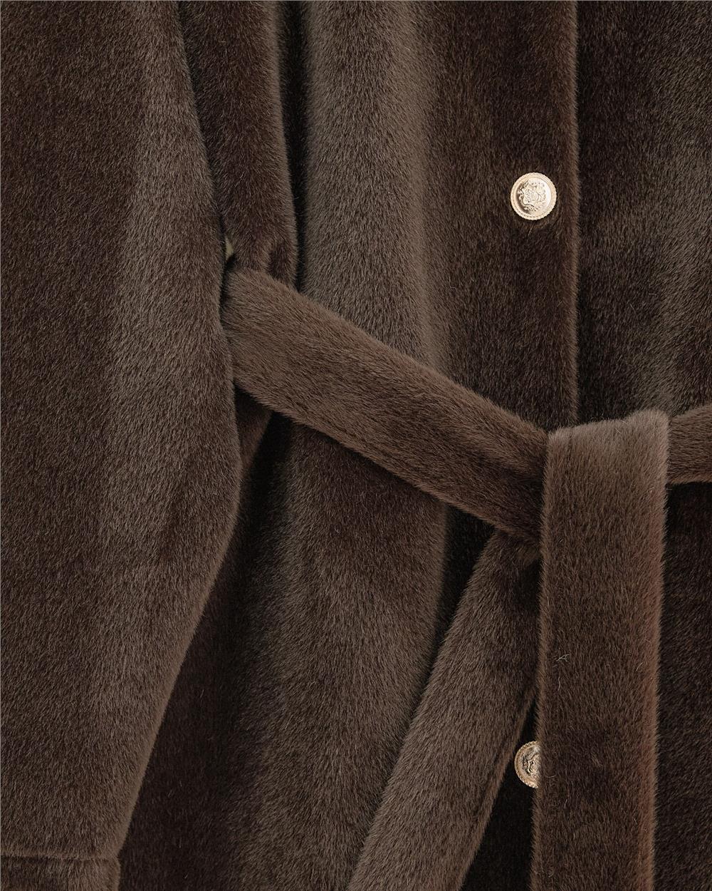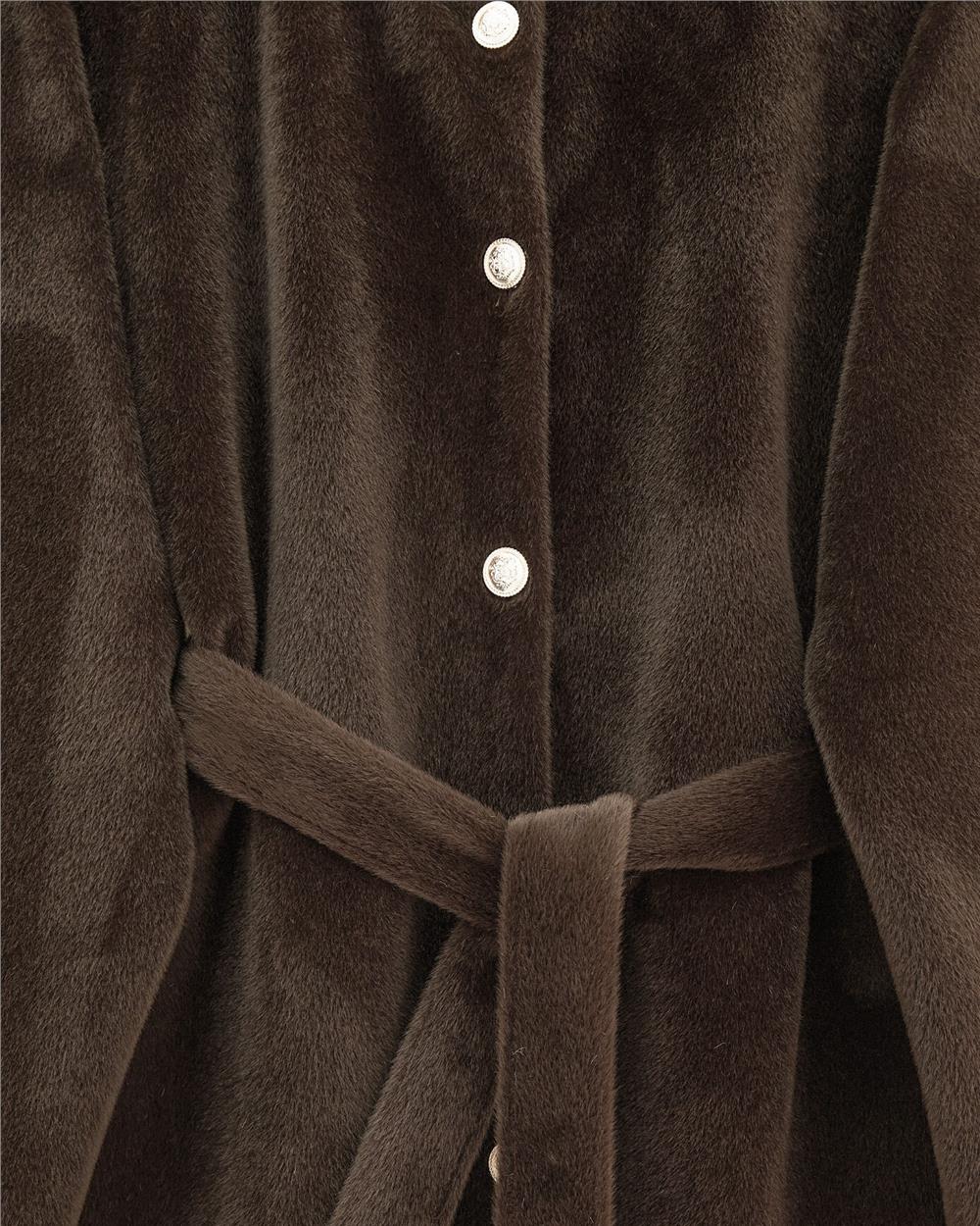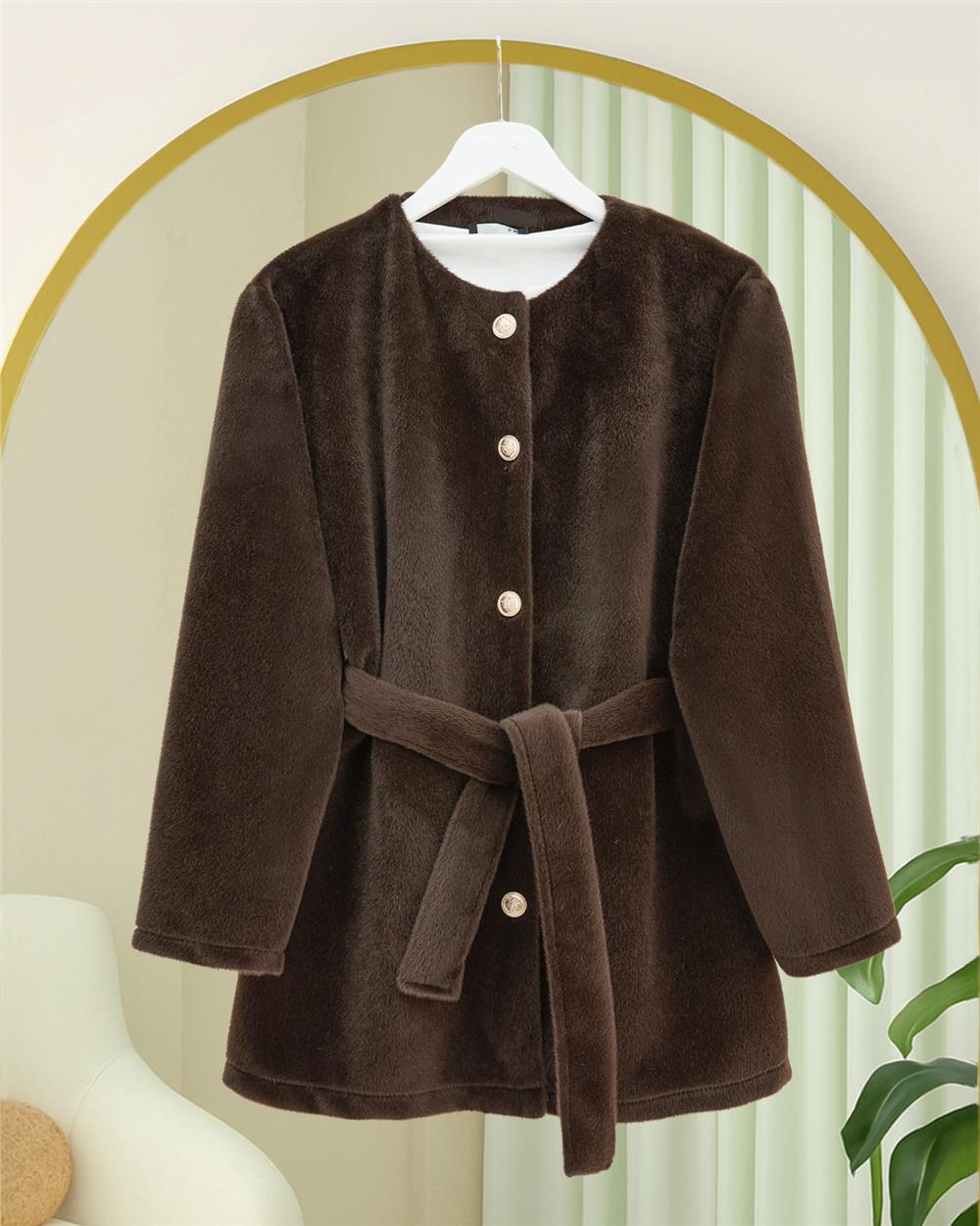 Düğmeli Beli Bağlamalı Kürklü Ceket -Toprak (111-50719-R55)