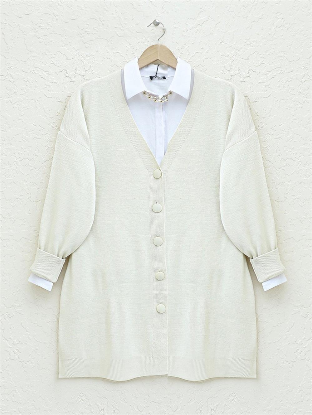 Düğmeli Kışlık Tesettür Triko Hırka -Krem (357-6031-R28)