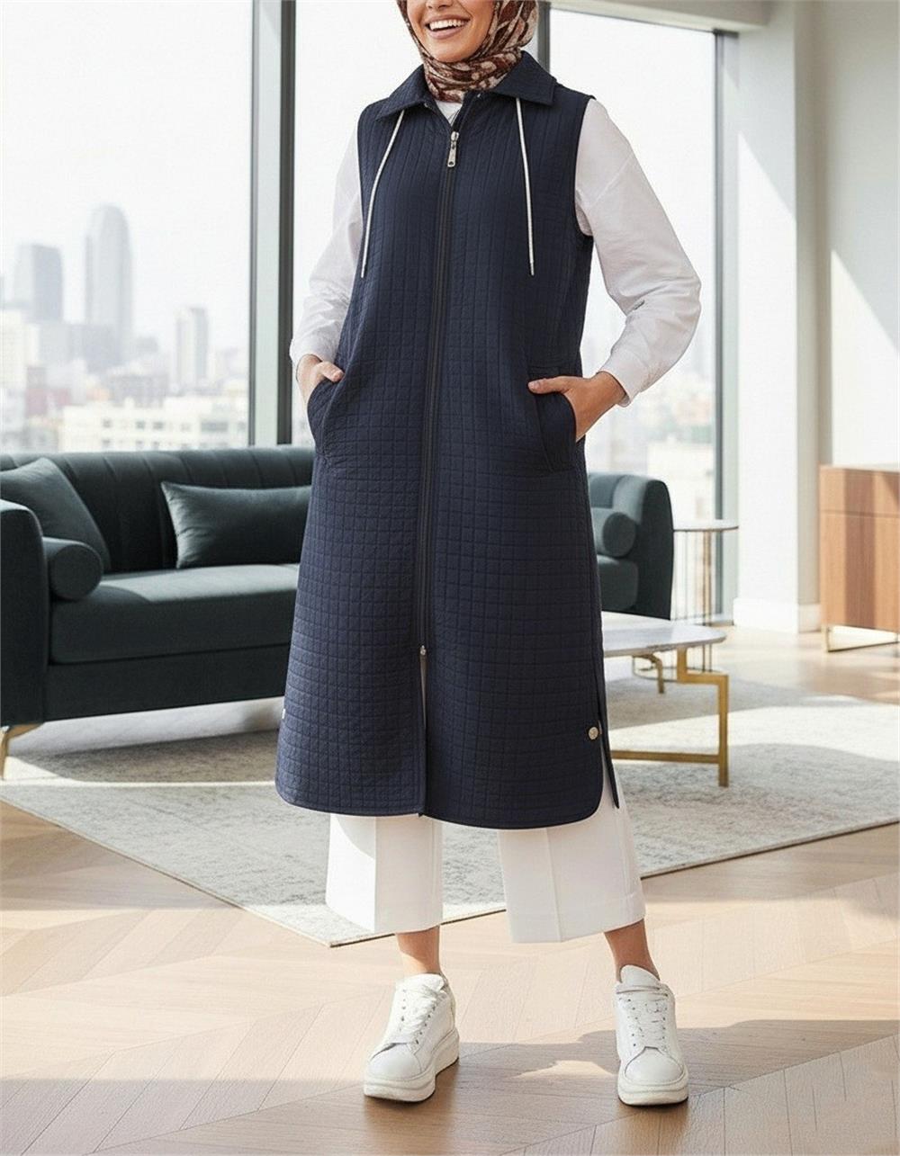 Fermuarlı Kapşonlu Cepli Uzun Kapitone Yelek -Laci (332-71311-R03)