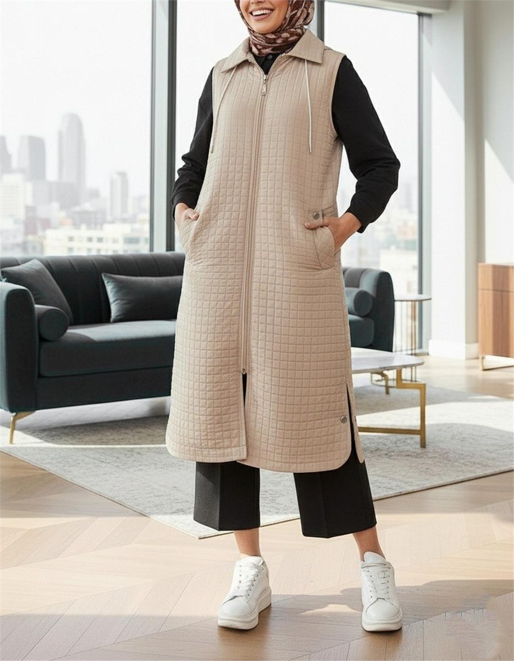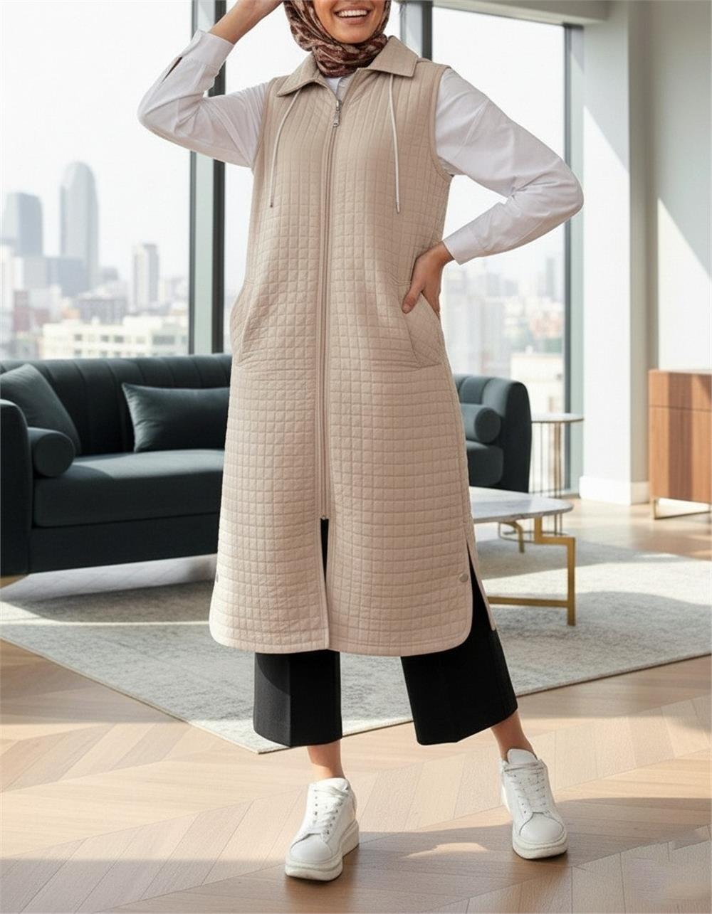 Fermuarlı Kapşonlu Cepli Uzun Kapitone Yelek -Taş (332-71311-R43)