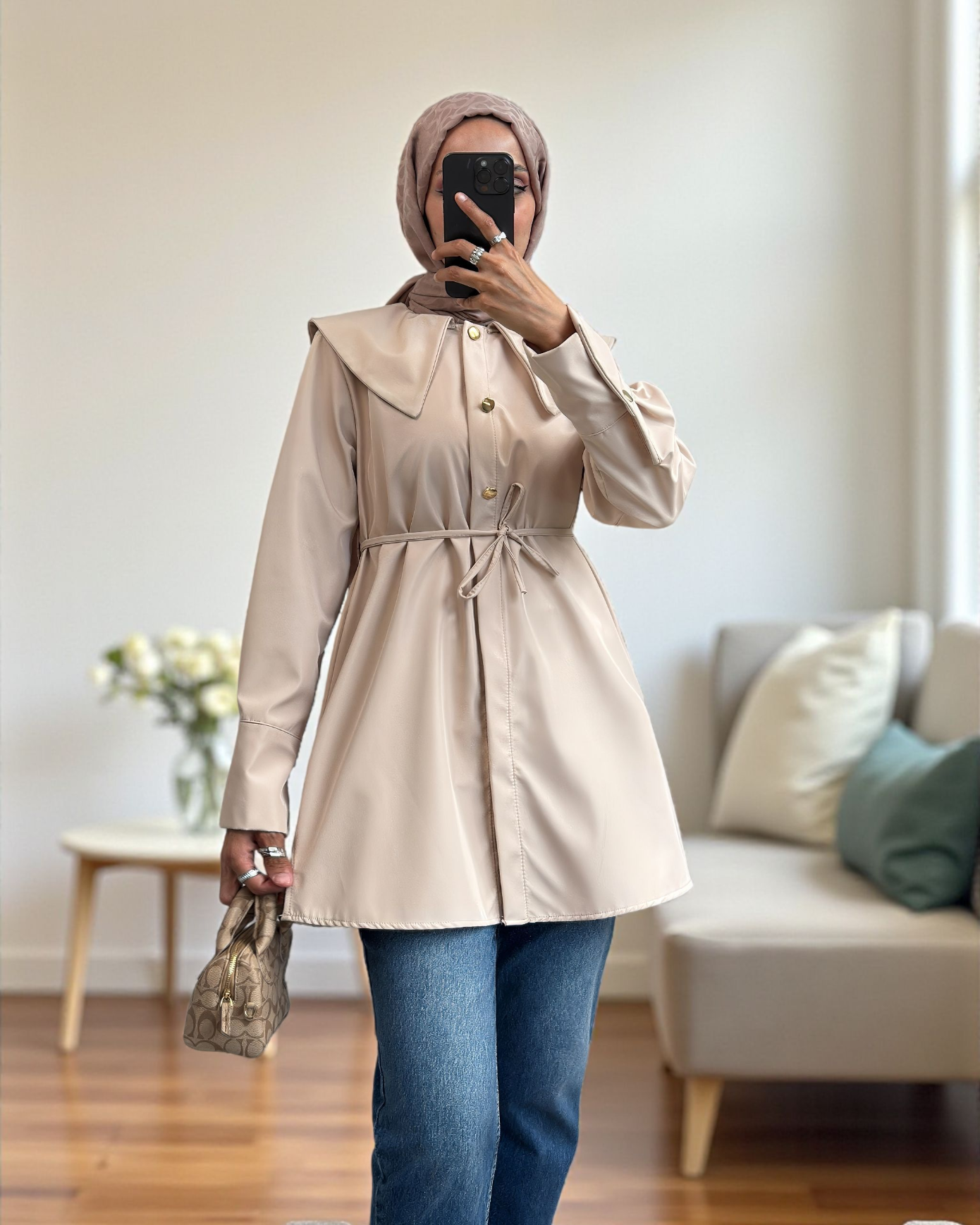 Geniş Yakalı Beli Bağlamalı Bonding Kap -Bej (120-1627-R56)