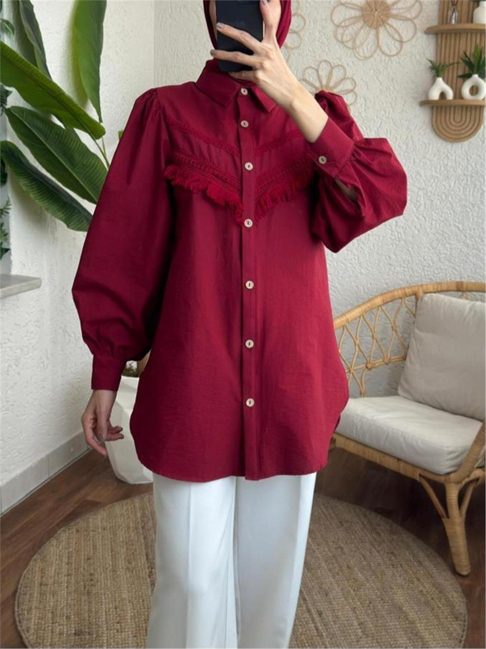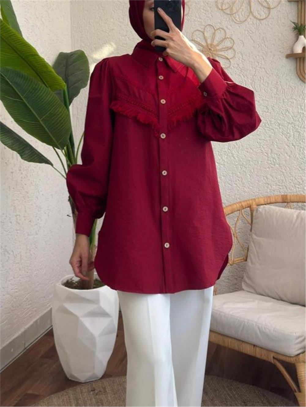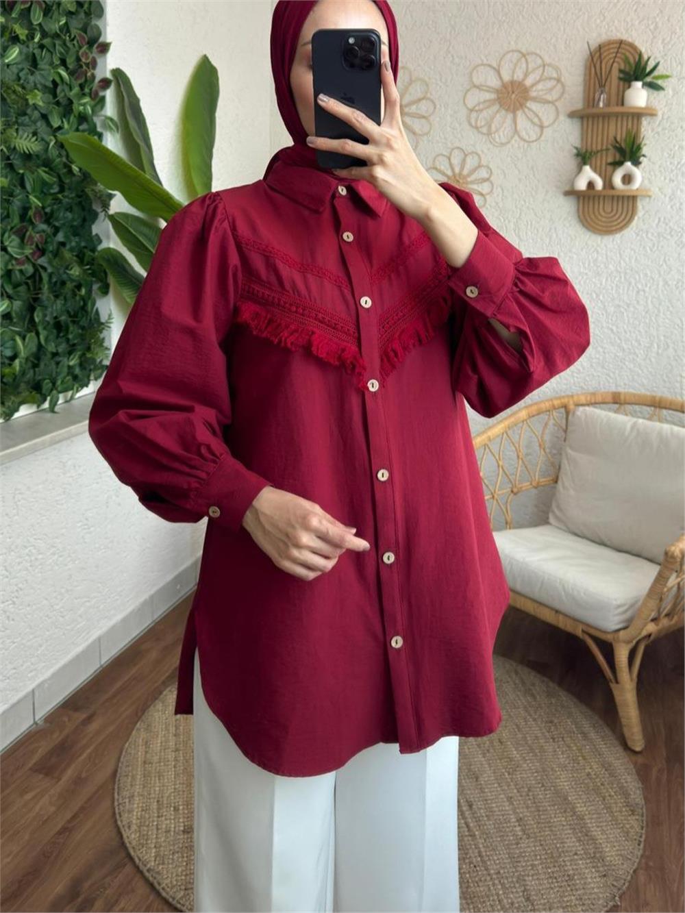 Güpür Püsküllü Ham Cupra Balon Kol Gömlek -Bordo (307-2189-R04)
