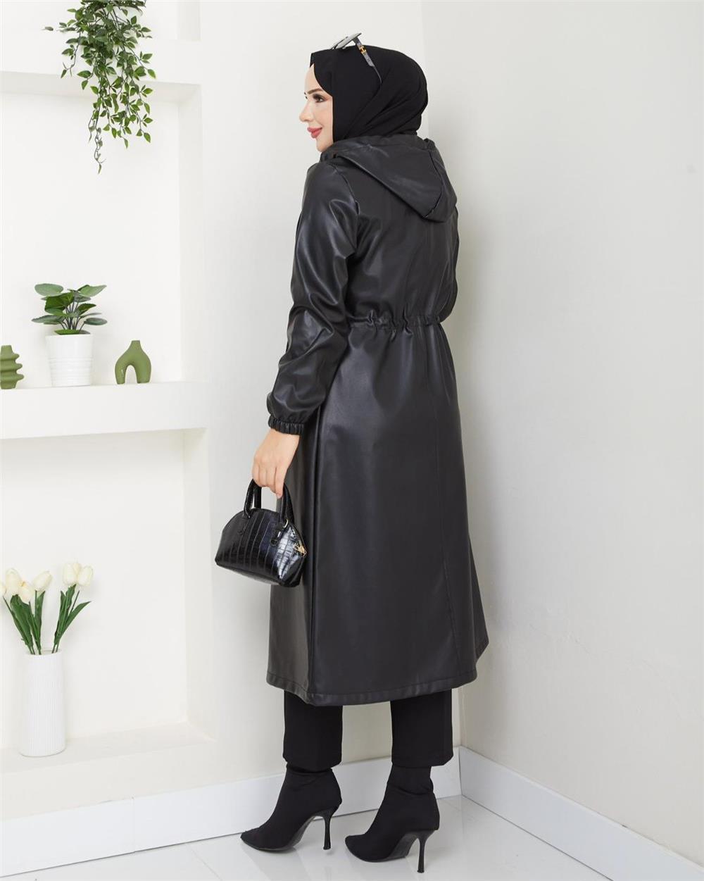Kapşonlu Cepli Beli Bağcıklı Kolu Lastikli Deri Kap -Siyah (197-1202DERİ-R01)