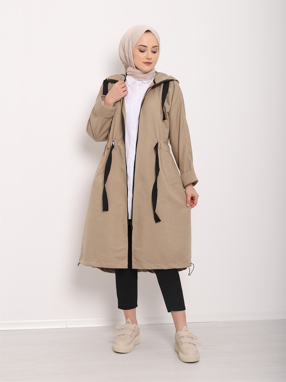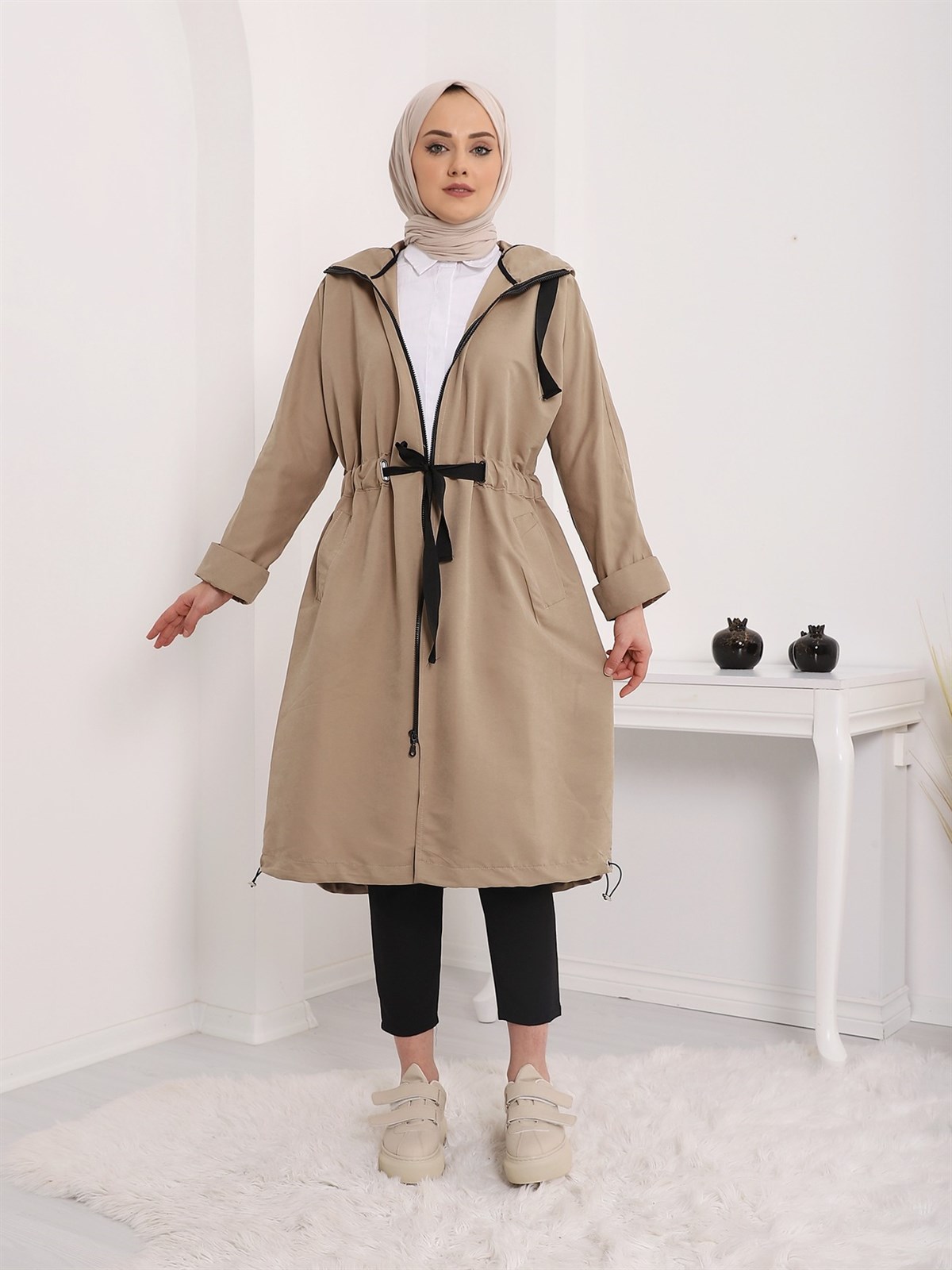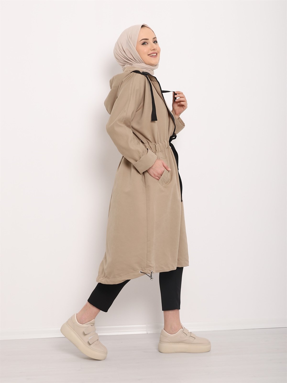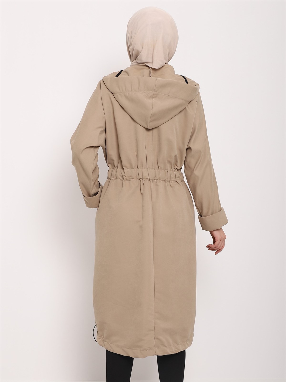 Kapşonlu Eteği Lastikli Beli Büzgülü Trenckot -Stone (102-14020-R43)