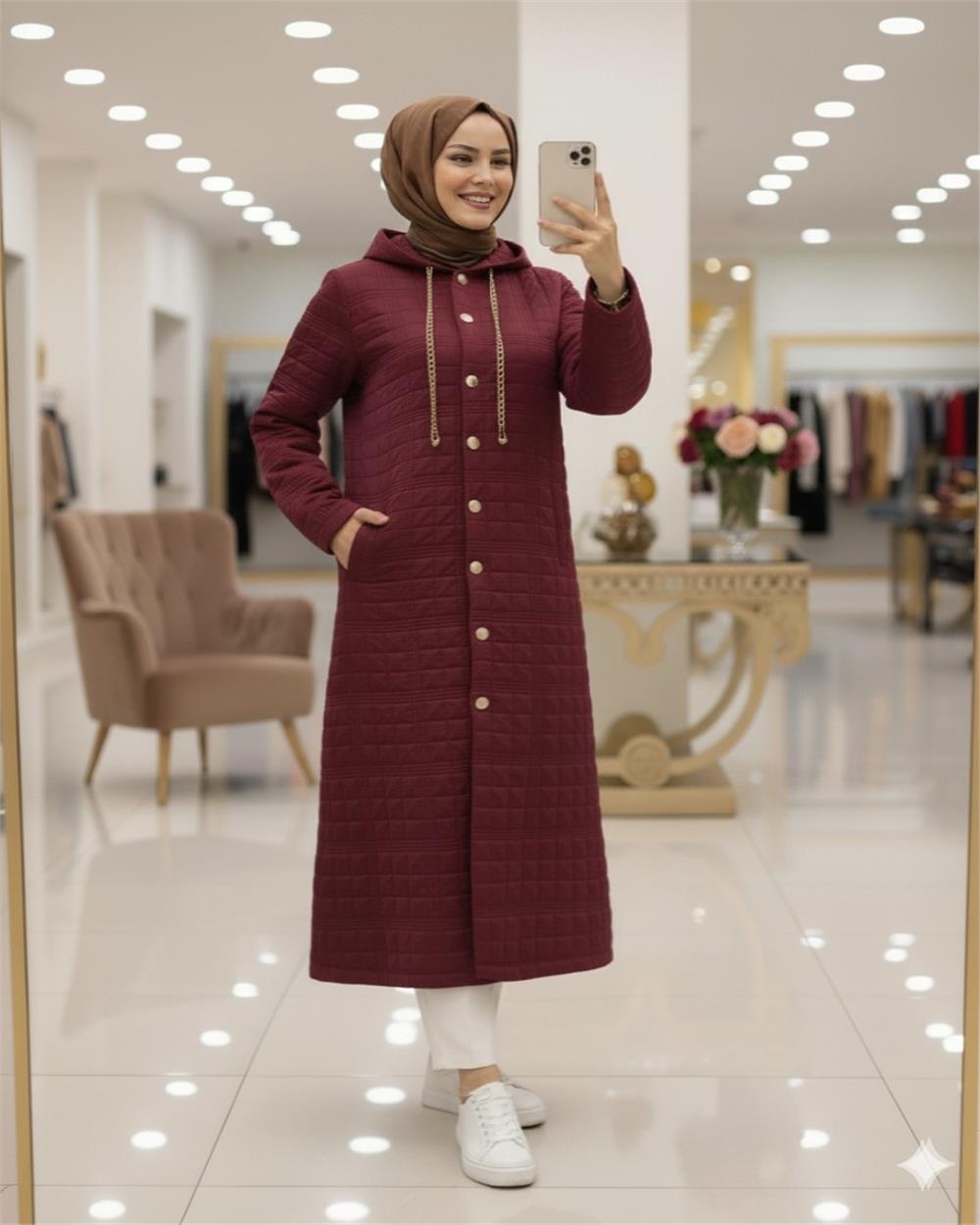 Kapşonlu Önü Düğmeli Zincir Detaylı Kapitone Kap -Bordo (332-71235-R04)