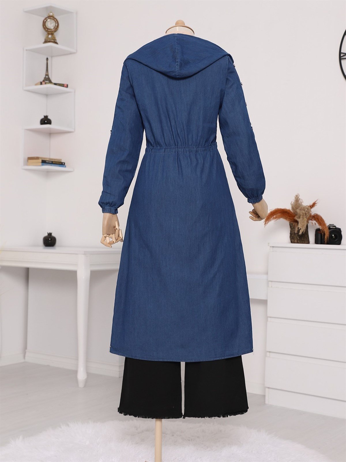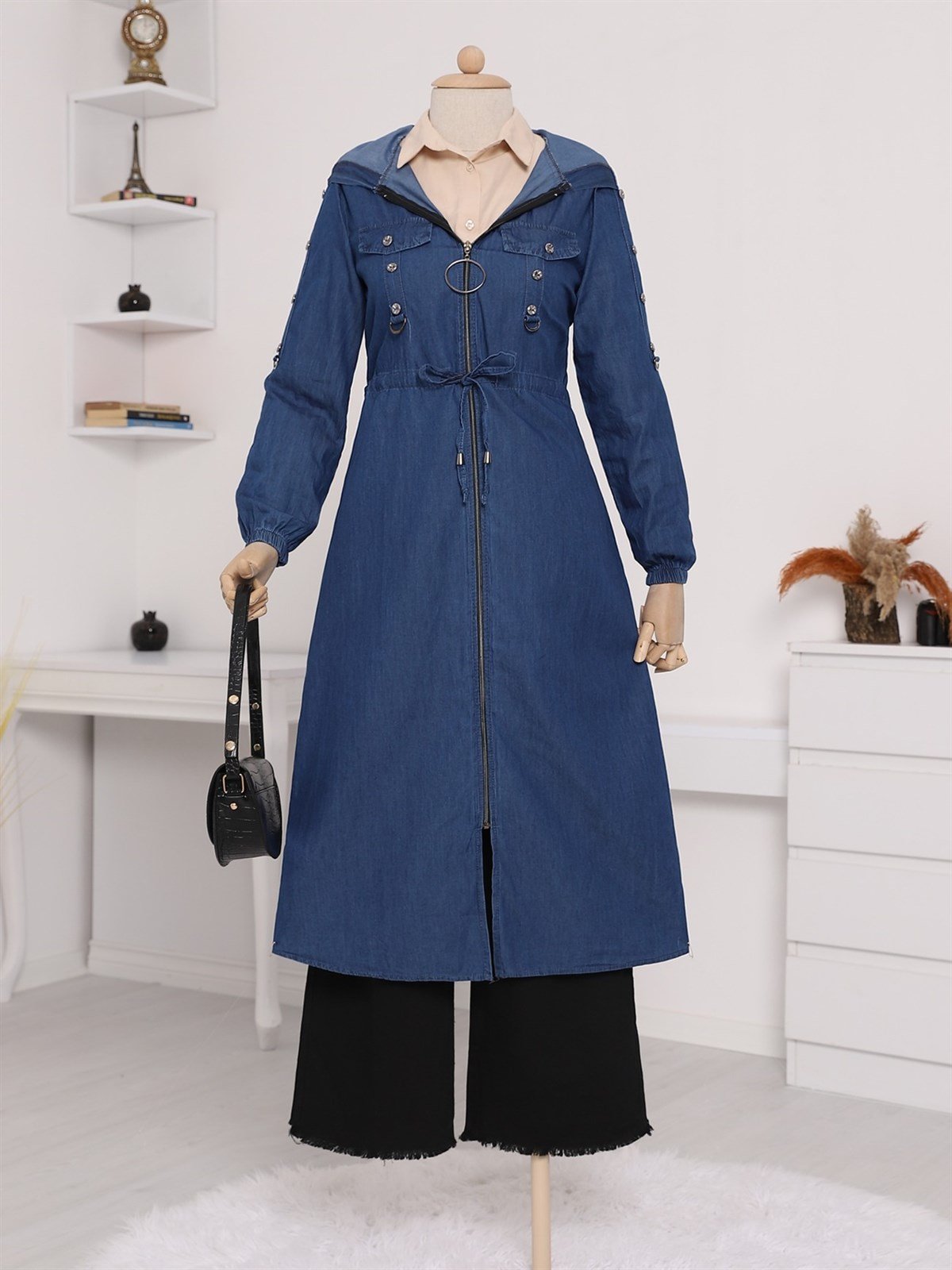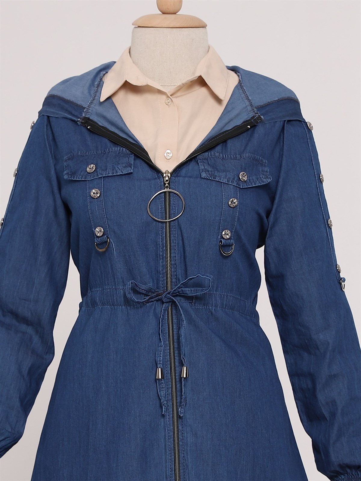 Kapşonlu Tünel Bağcıklı Düğme Detaylı Kot Kap -Indigo (186-502-R21)