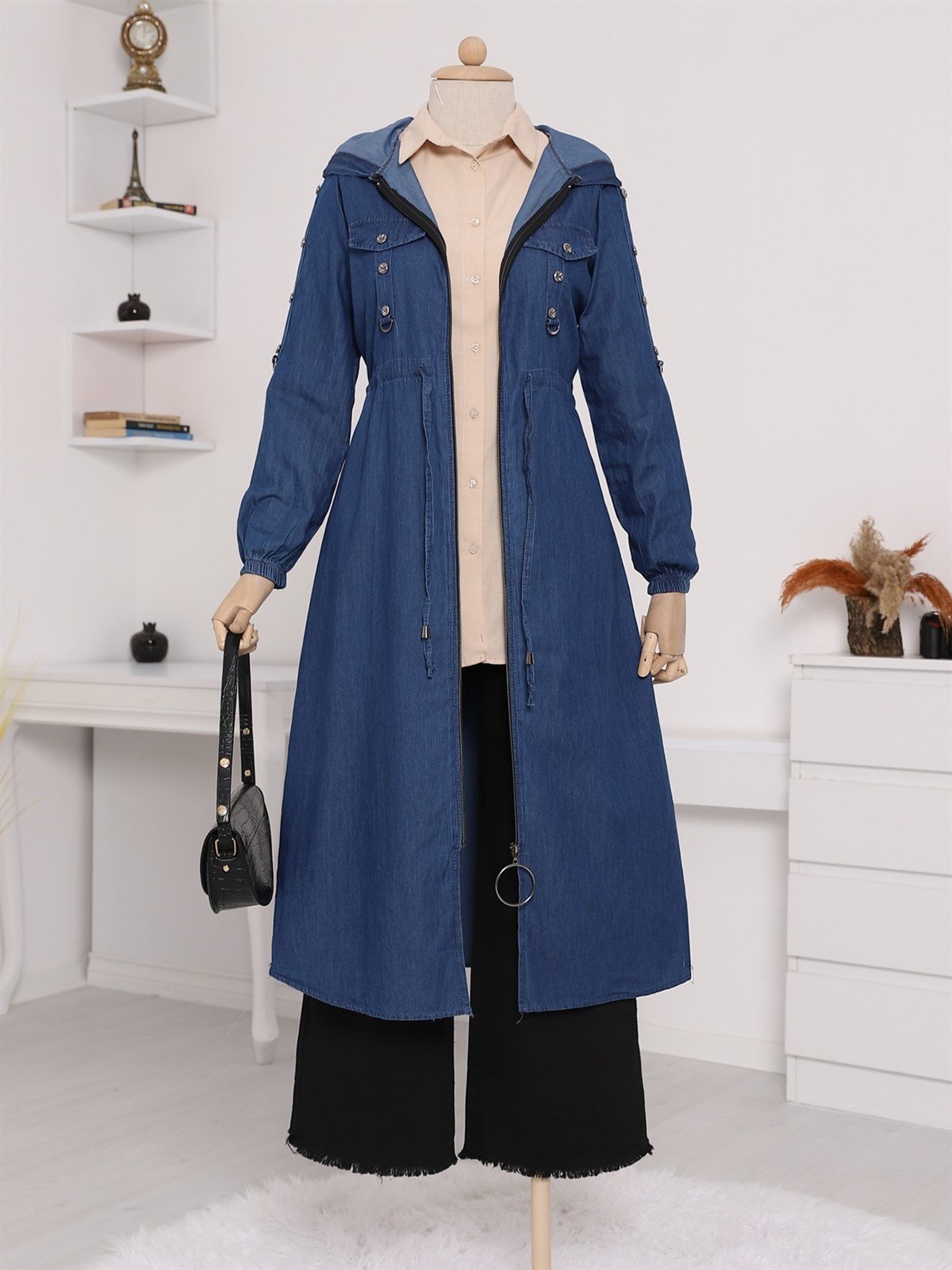 Kapüşonlu, beli büzgülü, önden fermuarlı, kolu düğme detaylı kot kap modelimiz yeni sezonun en trend modelleri arasında yerini almıştır.