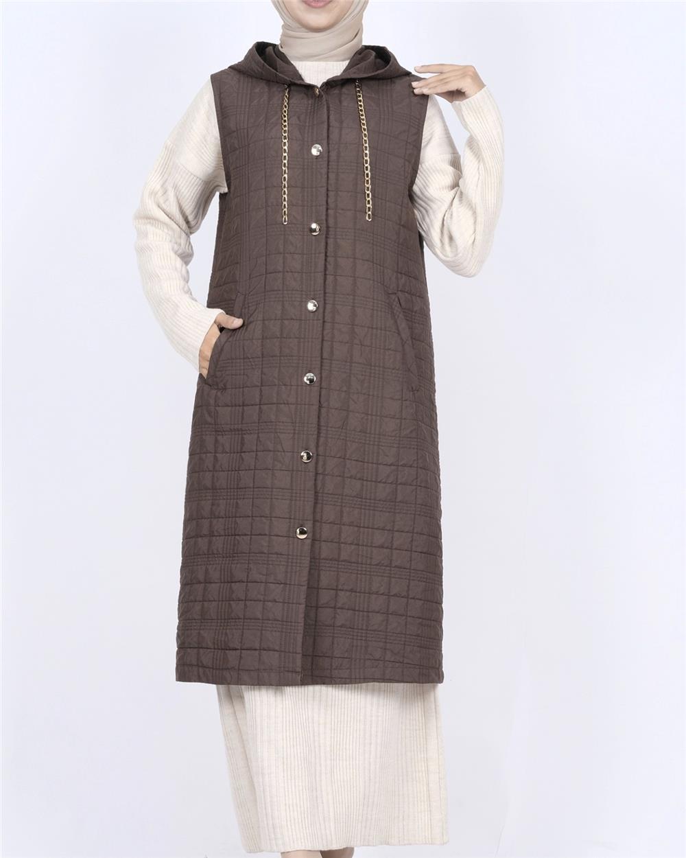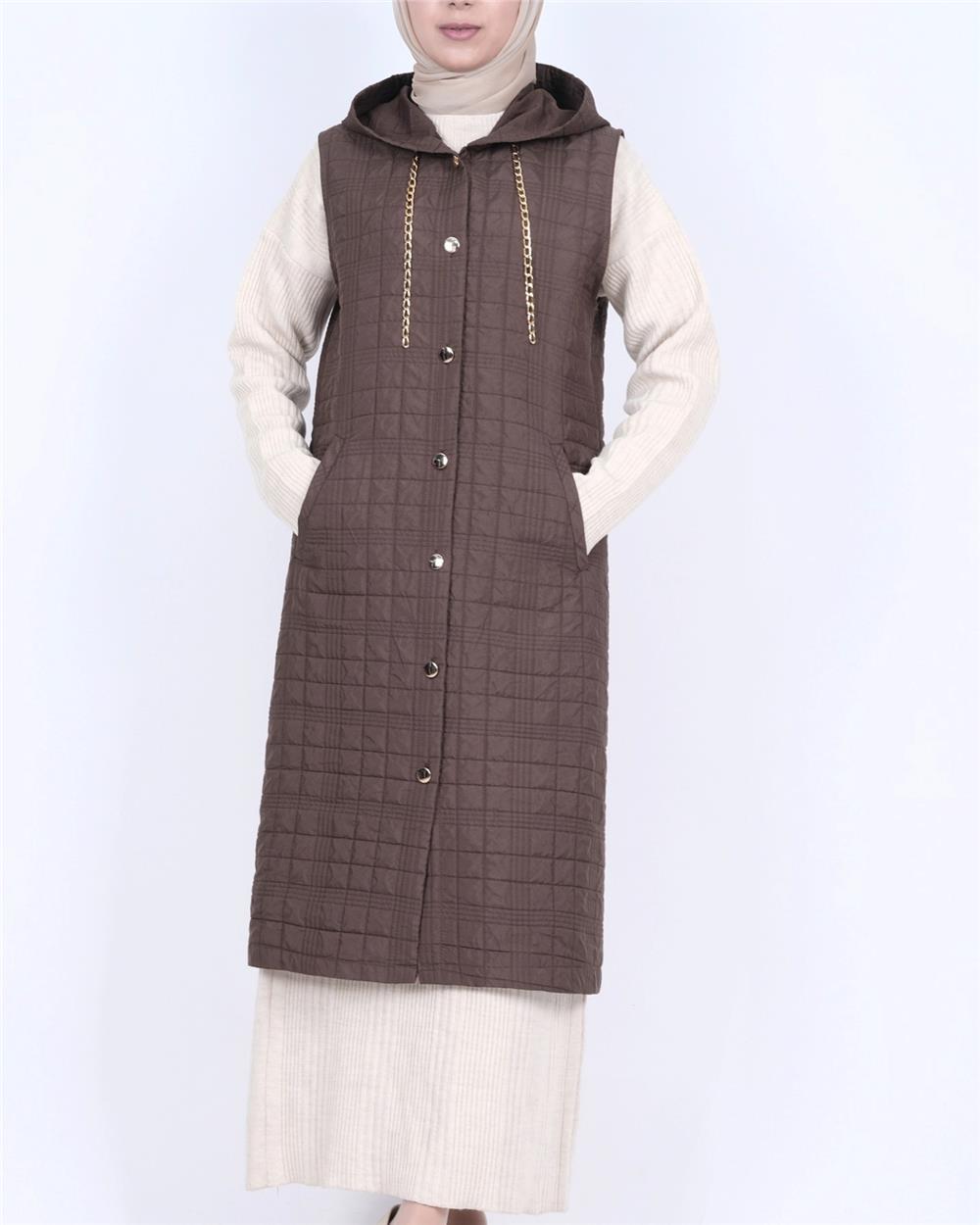 Kapşonlu Zincir Detaylı Cepli Kapitone Yelek -K. Kahve (111-70195-R54)