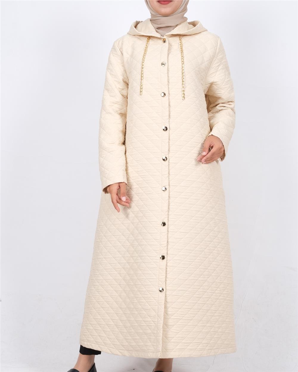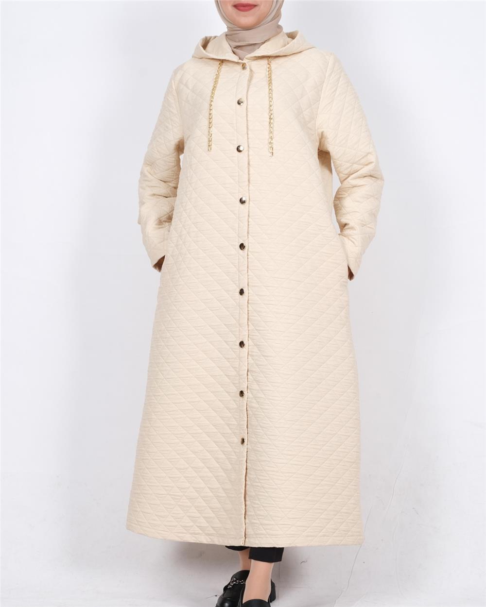 Kapşonlu Zincir Detaylı Düğmeli Kapitone Kap -Bej (111-50771-R56)