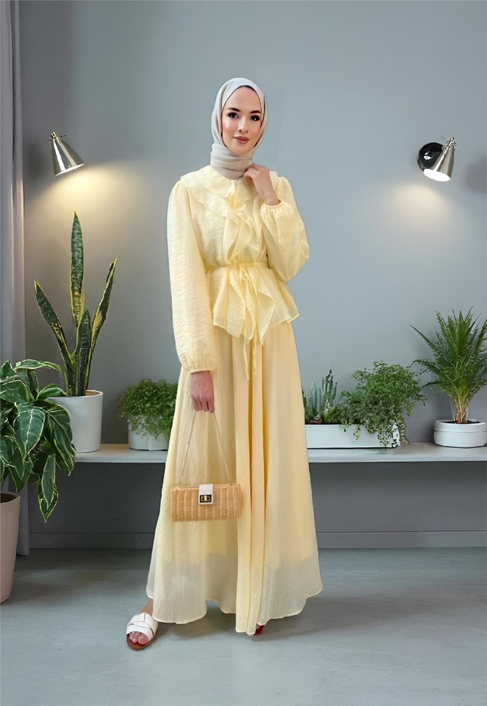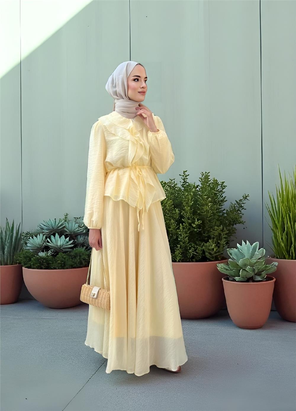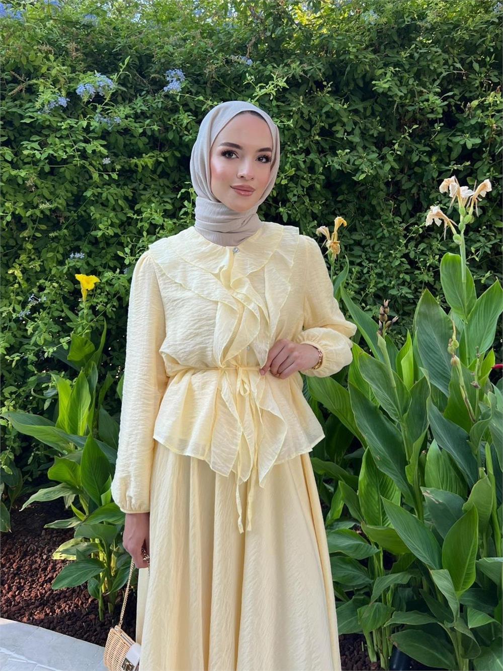 Kolları Lastikli Fırfırlı İp Detaylı Düğmeli İkili Takım -Açık Sarı (114-764-R75)