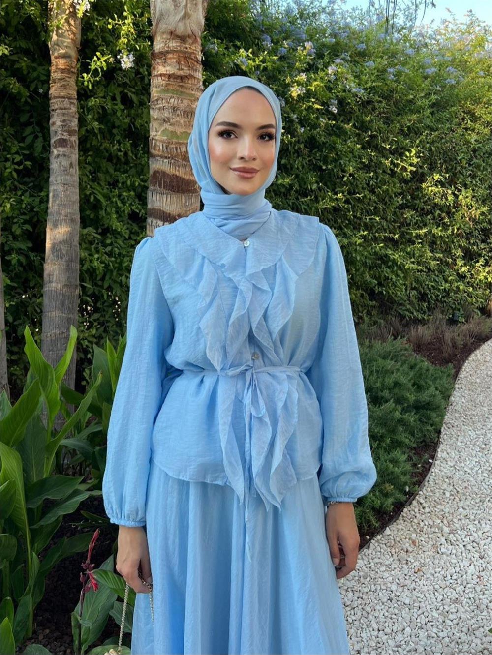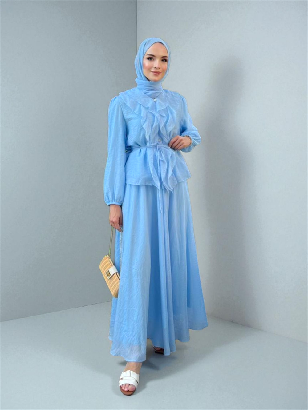 Kolları Lastikli Fırfırlı İp Detaylı Düğmeli İkili Takım -Bebe Mavi (114-764-R32)