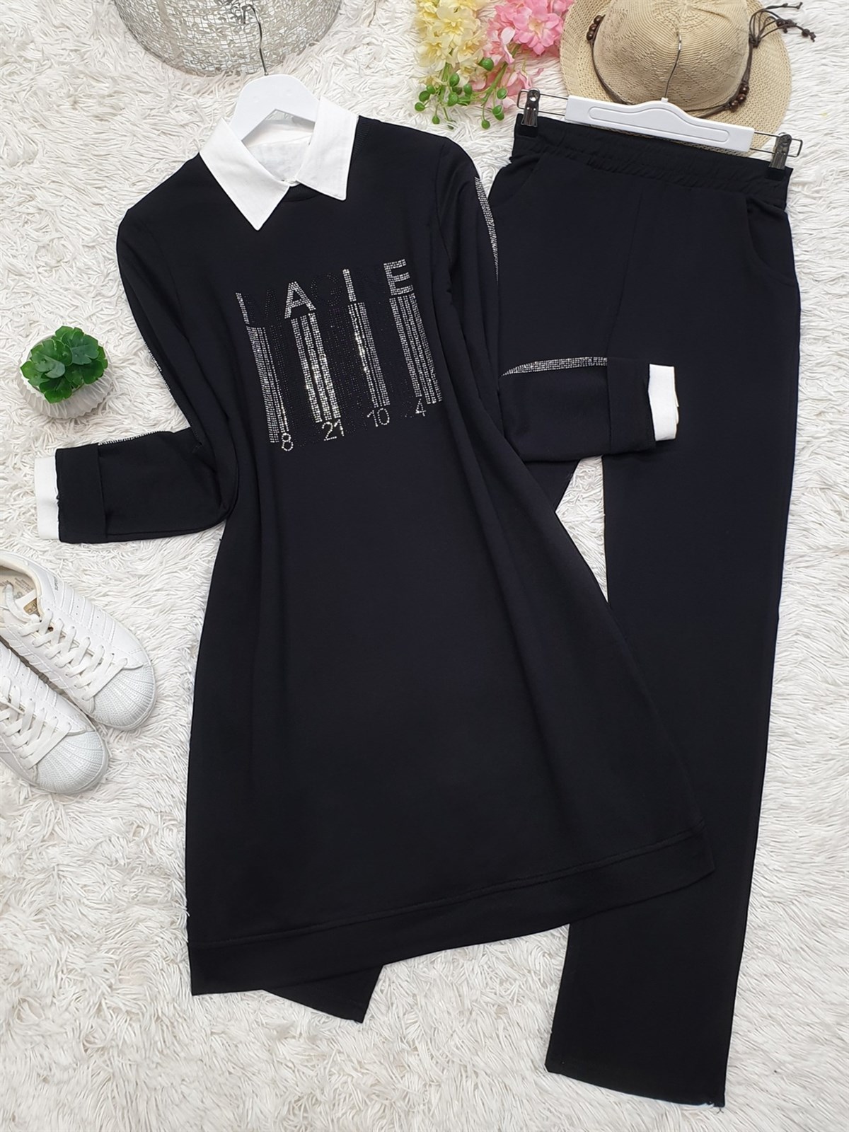 Önü ve Kolları Taş Baskılı Siyah Penye Takım