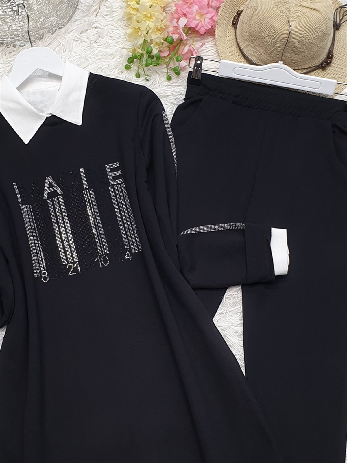 Kolları ve Önü Taş Baskılı Penye Takım -Black (332-7029-R01)