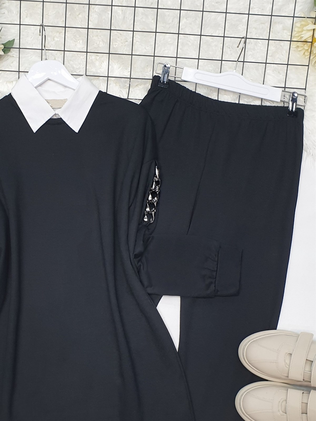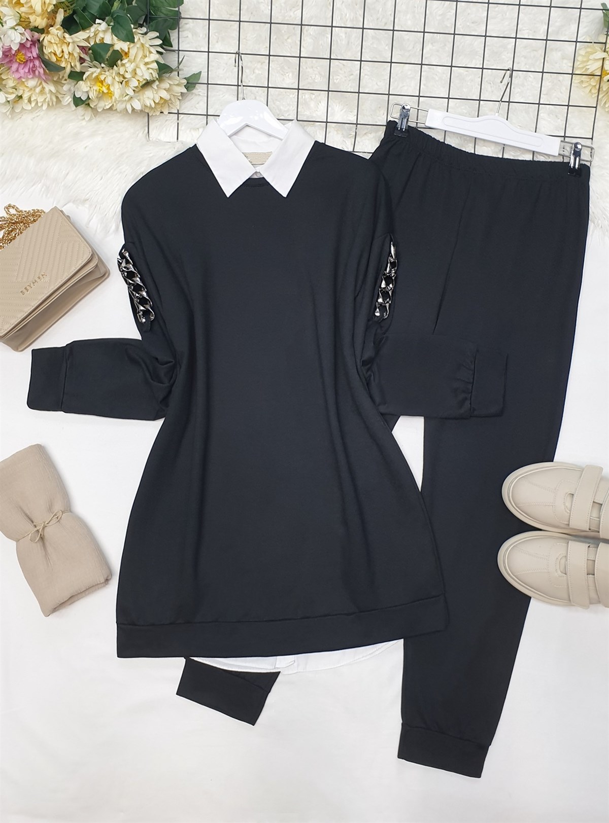 Kolları Zincir Detaylı Penye Takım -Black (295-7058-R01)