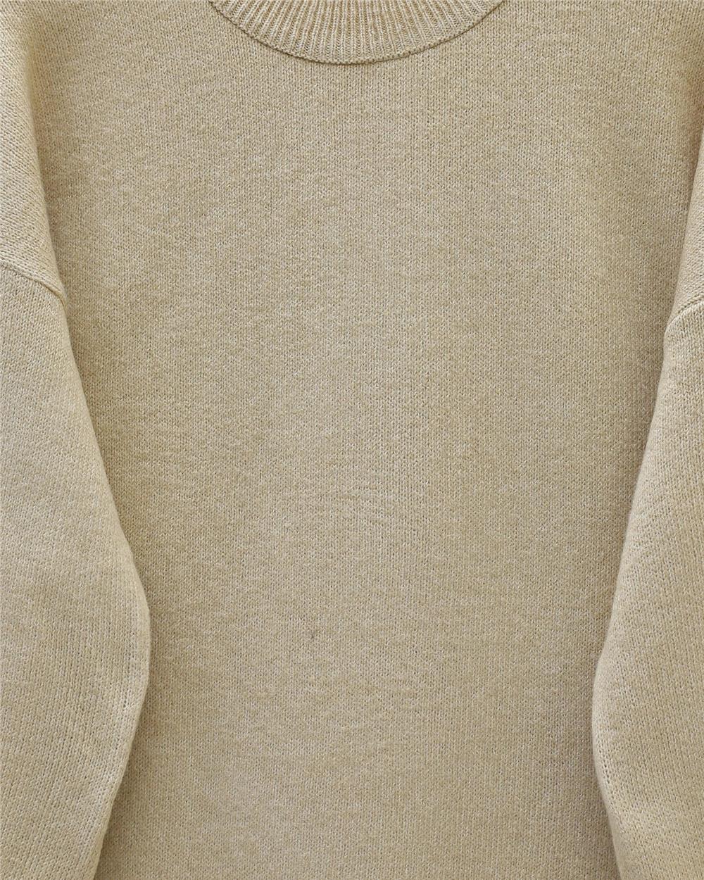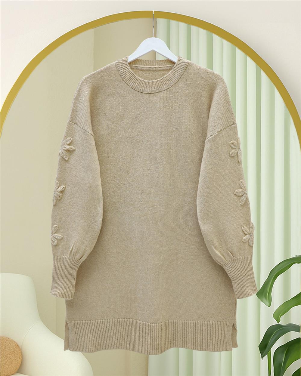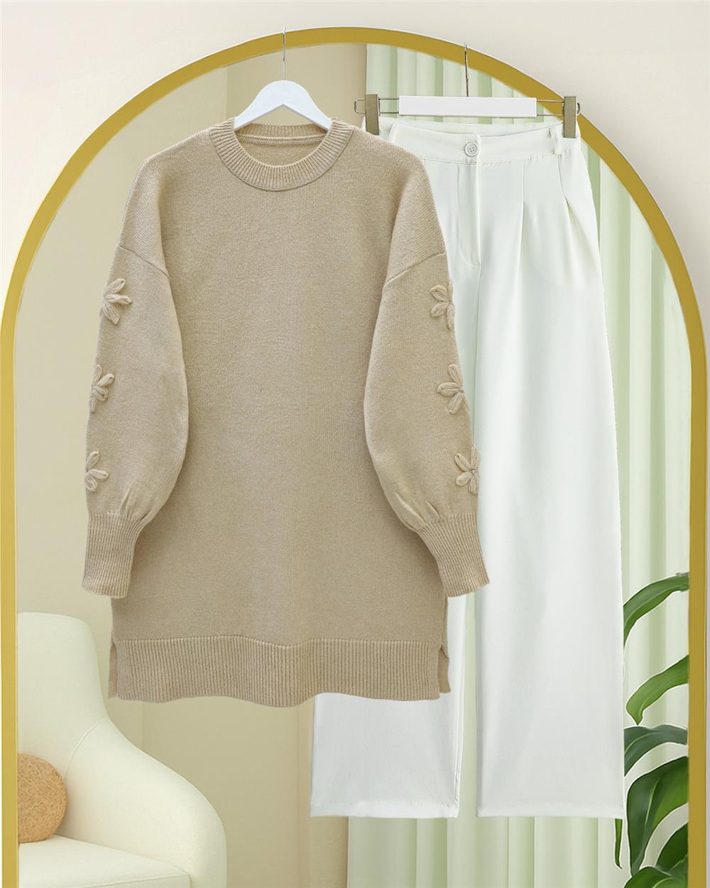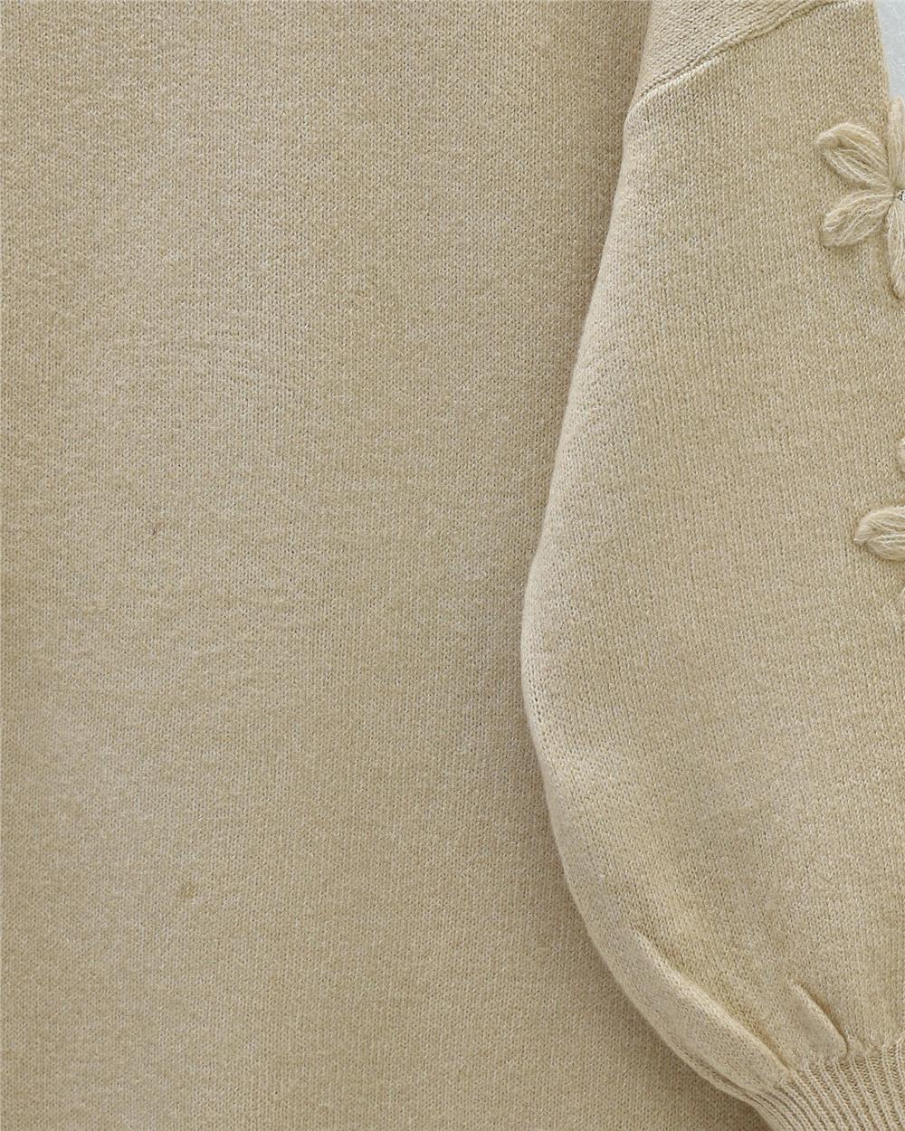 Kolu Çiçek Detaylı Yuvarlak Yaka Yumoş Triko Kazak -Açık Vizon (295-4526-R51)