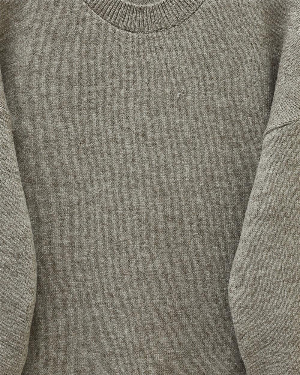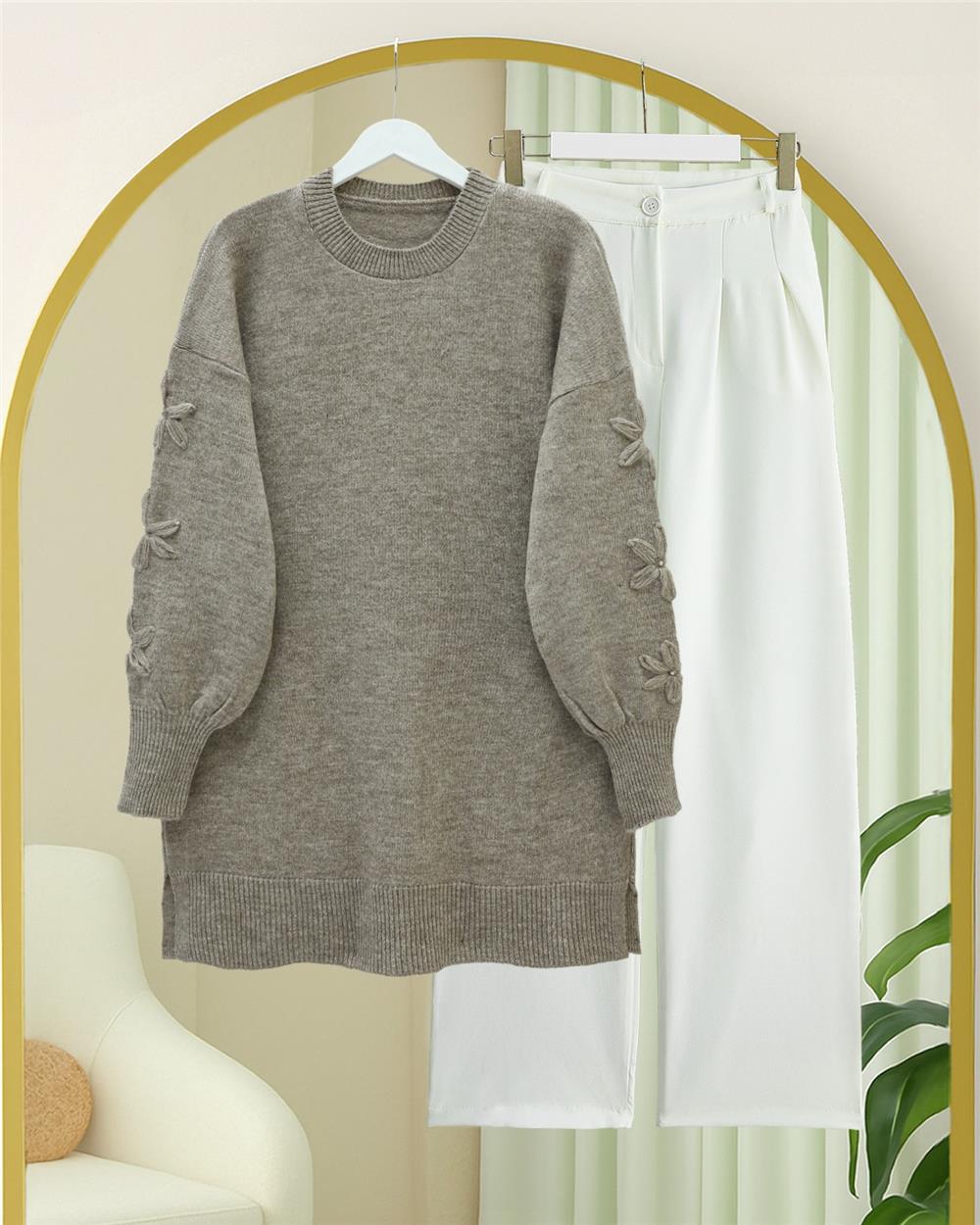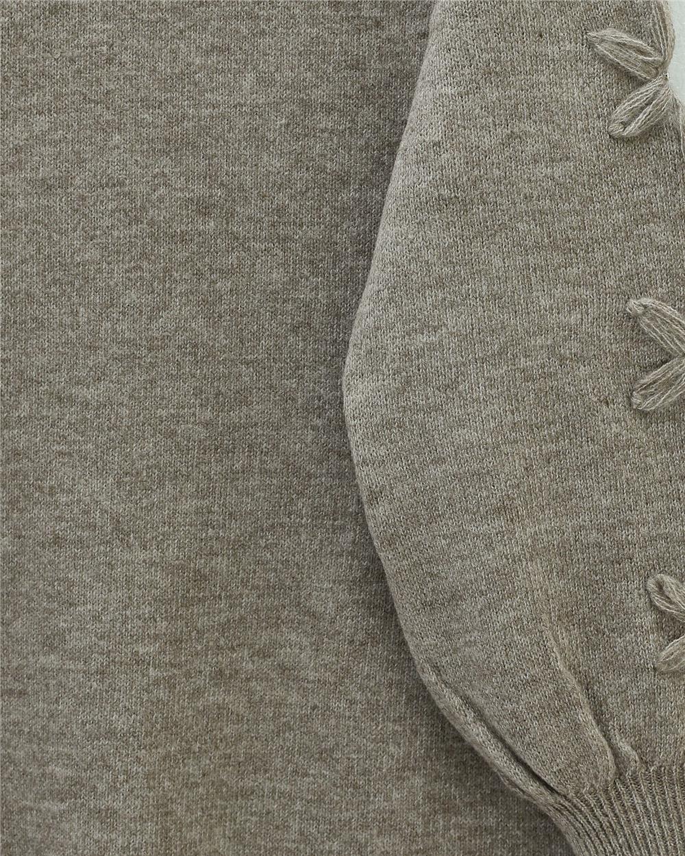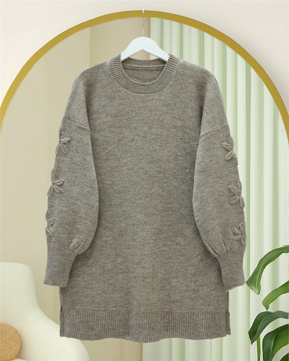 Kolu Çiçek Detaylı Yuvarlak Yaka Yumoş Triko Kazak -Toprak (295-4526-R55)
