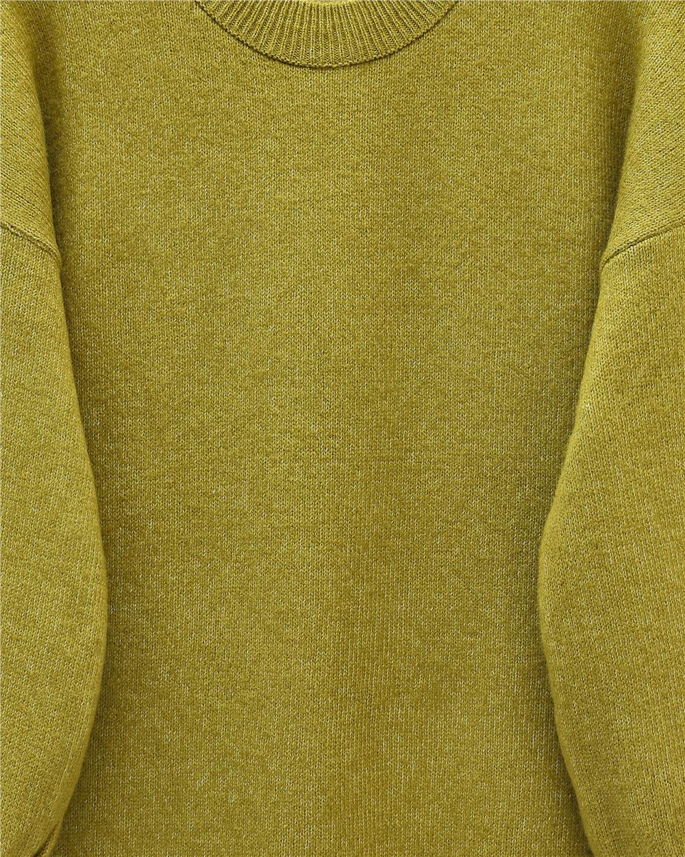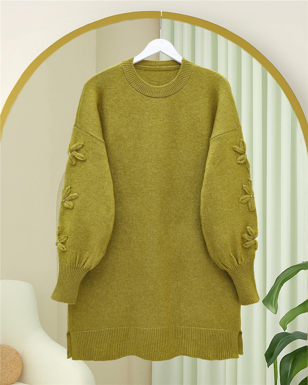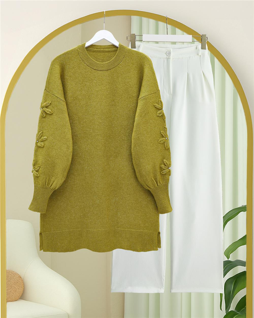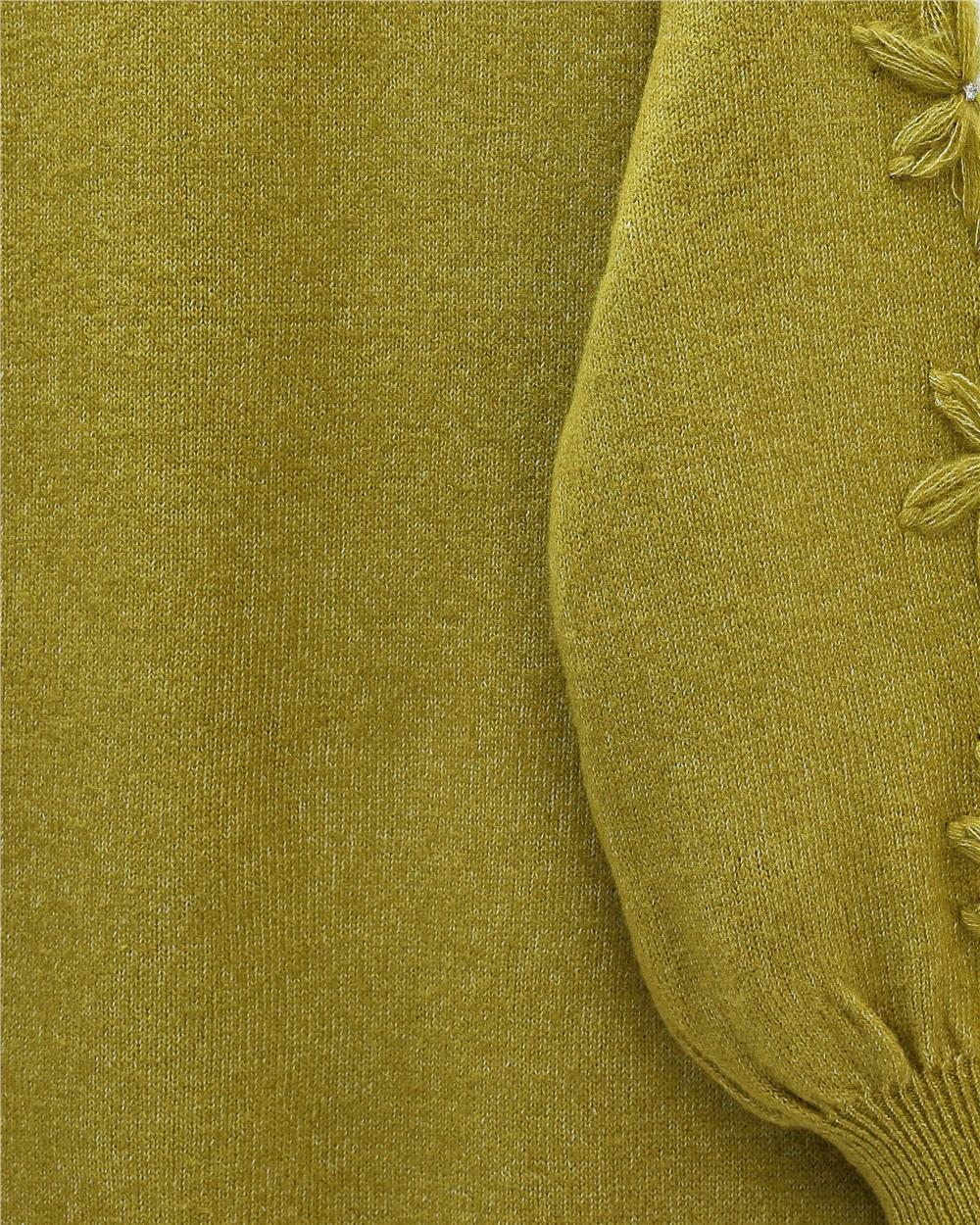 Kolu Çiçek Detaylı Yuvarlak Yaka Yumoş Triko Kazak -Yağ Yeşili (295-4526-R72)