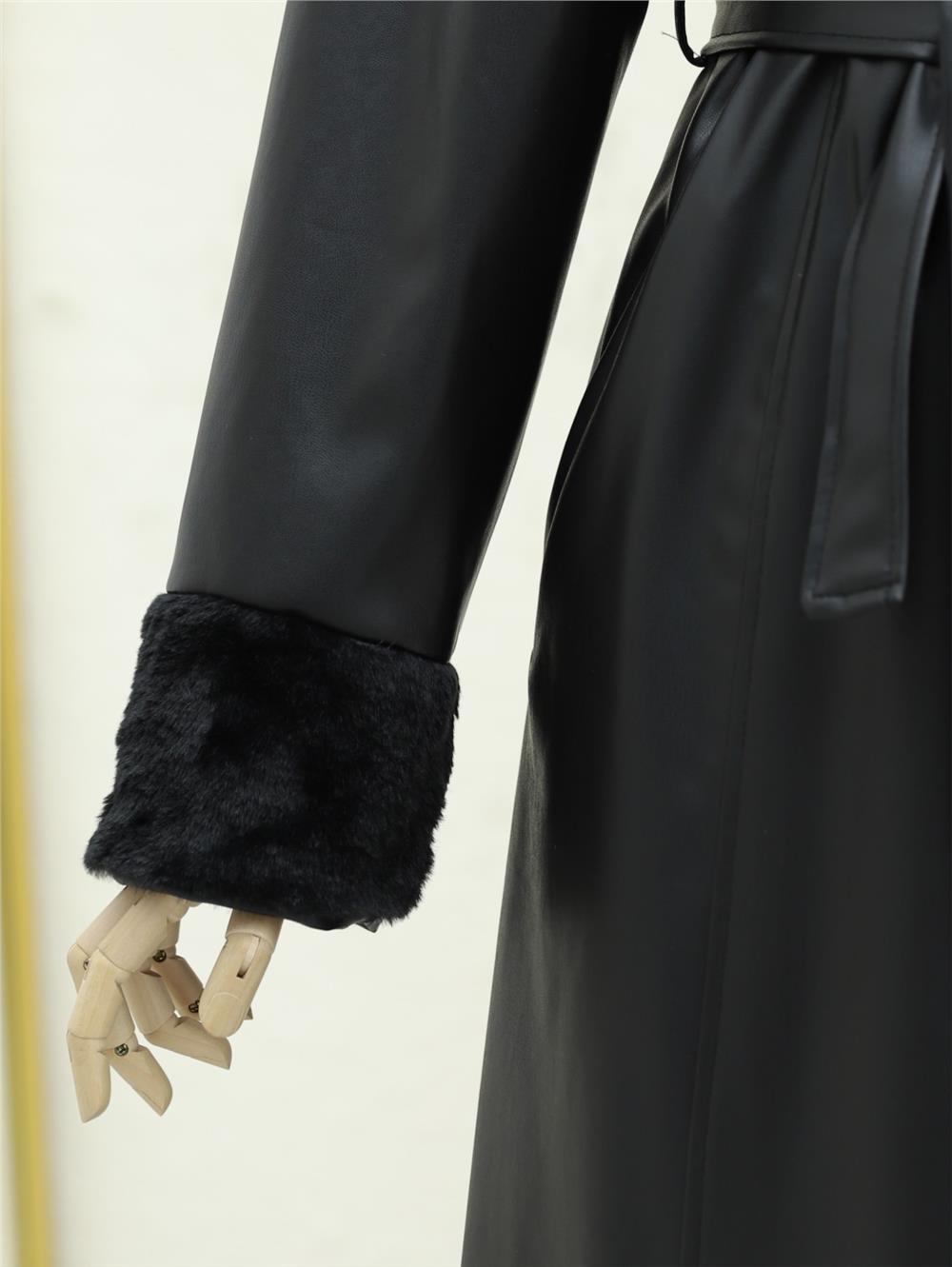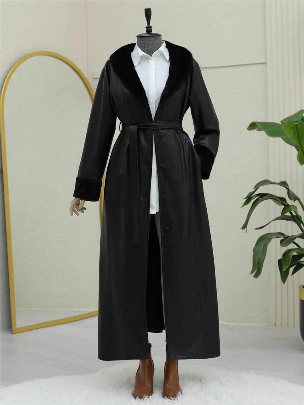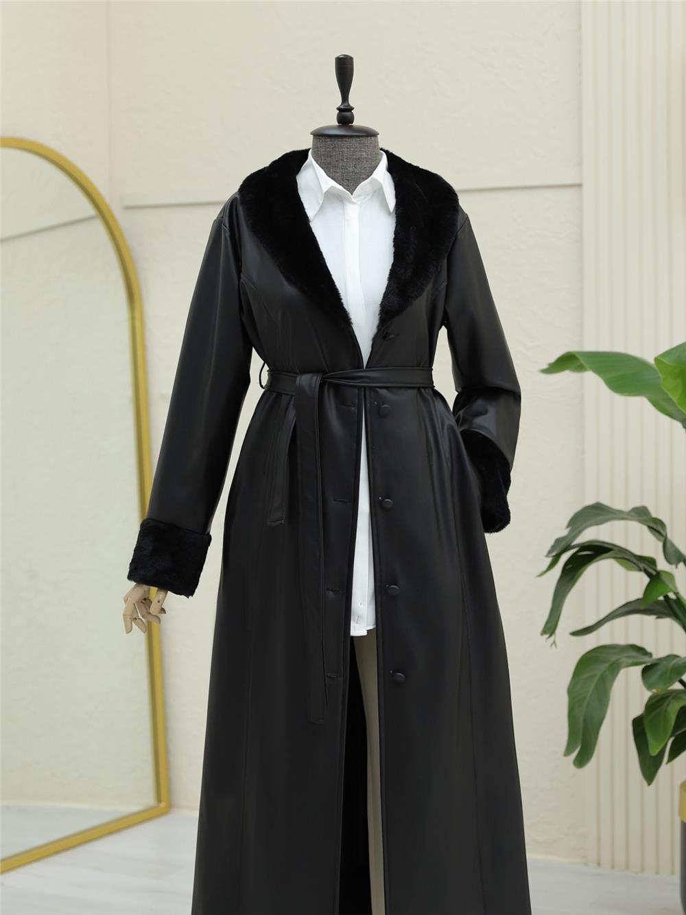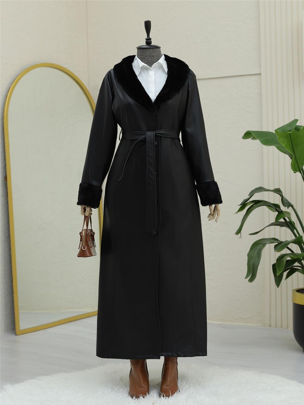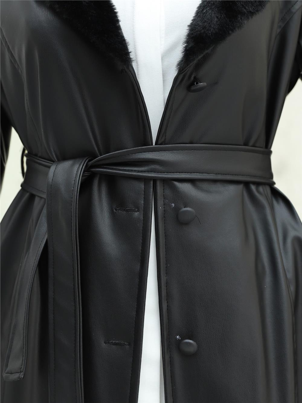 Kolu ve Yakası Peluşlu Bağcıklı Deri Pardesü -Siyah (197-9100-R01)