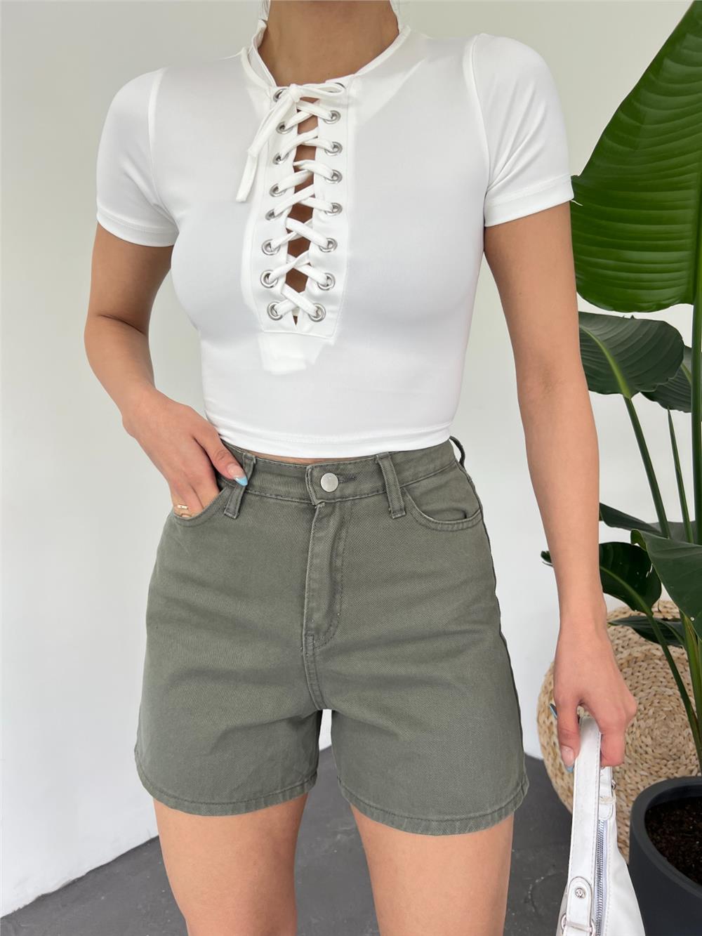 Eyelet Detailed Front Tie Crop T-Shirt -White (378-1744-R02)