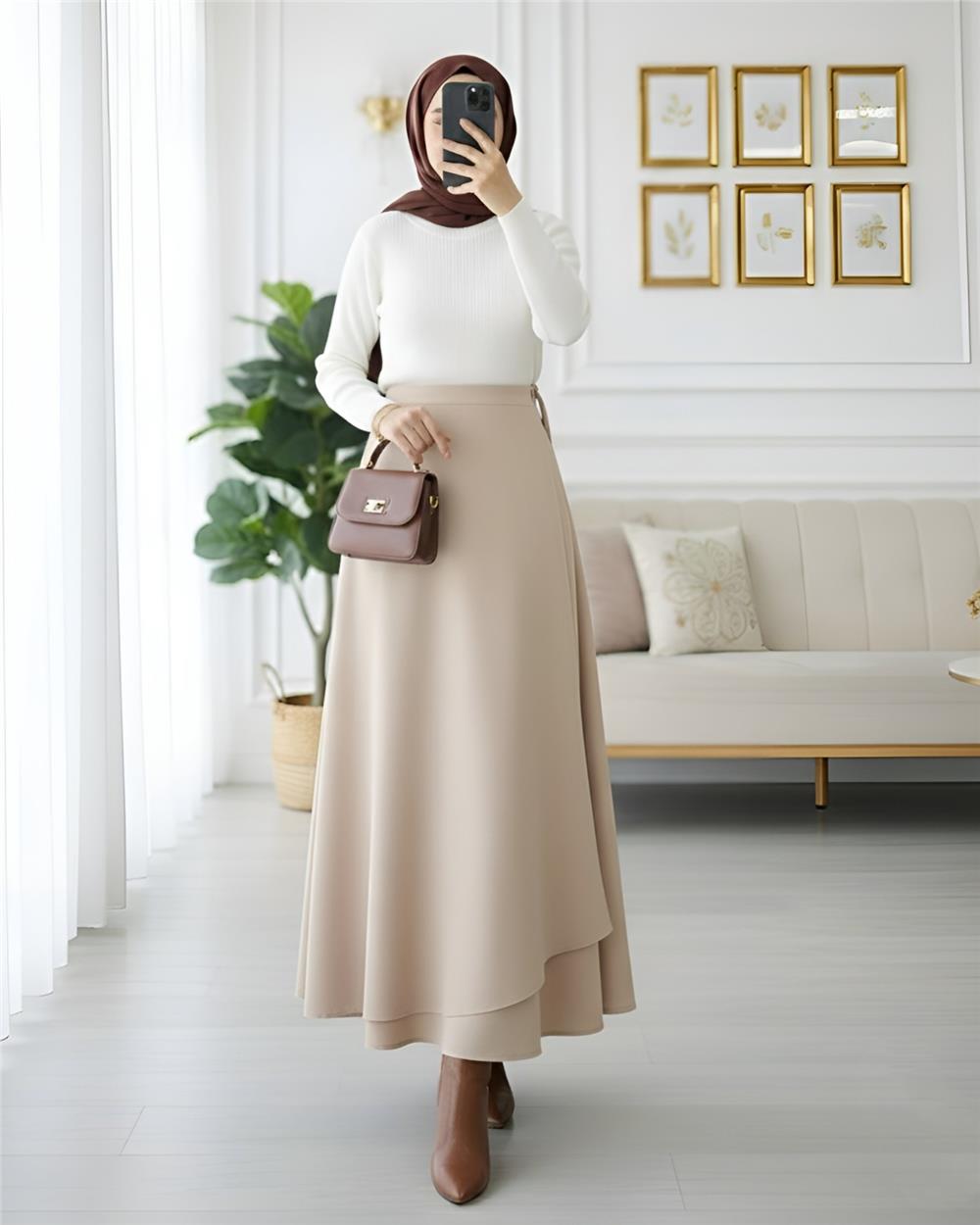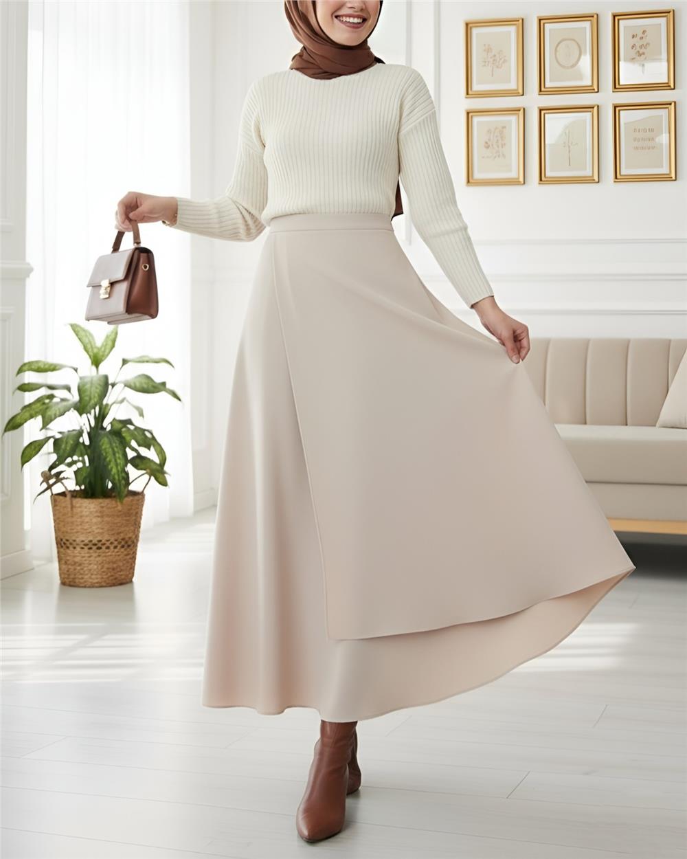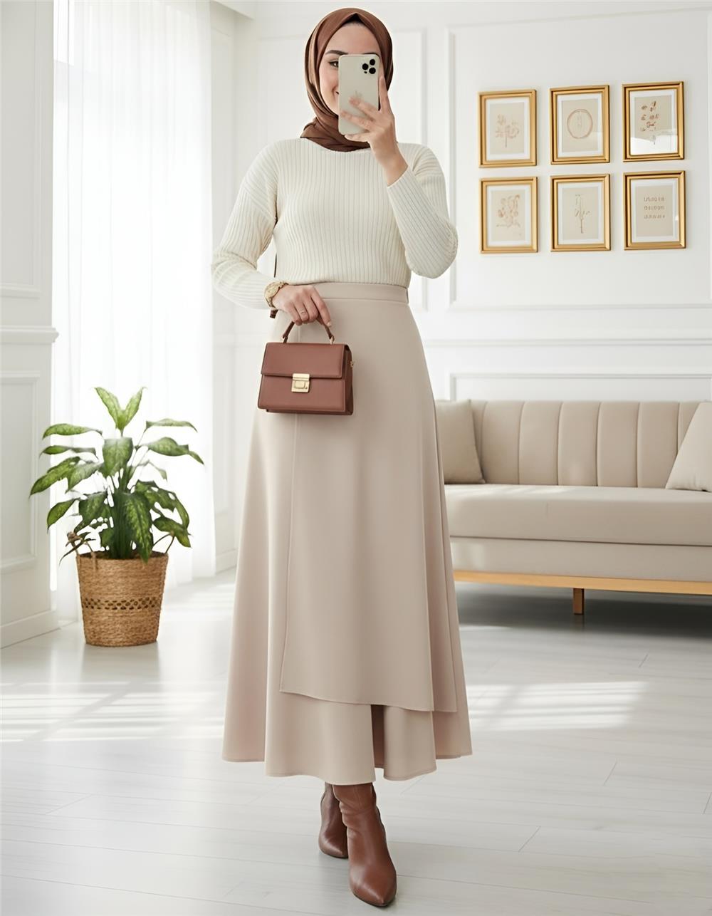 Önü Çapraz Çift Katlı Scuba Etek -Bej (120-1632-R56)