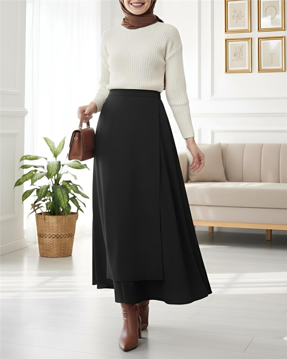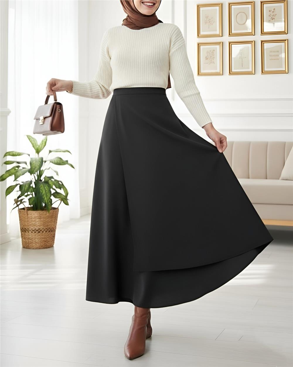Önü Çapraz Çift Katlı Scuba Etek -Siyah (120-1632-R01)