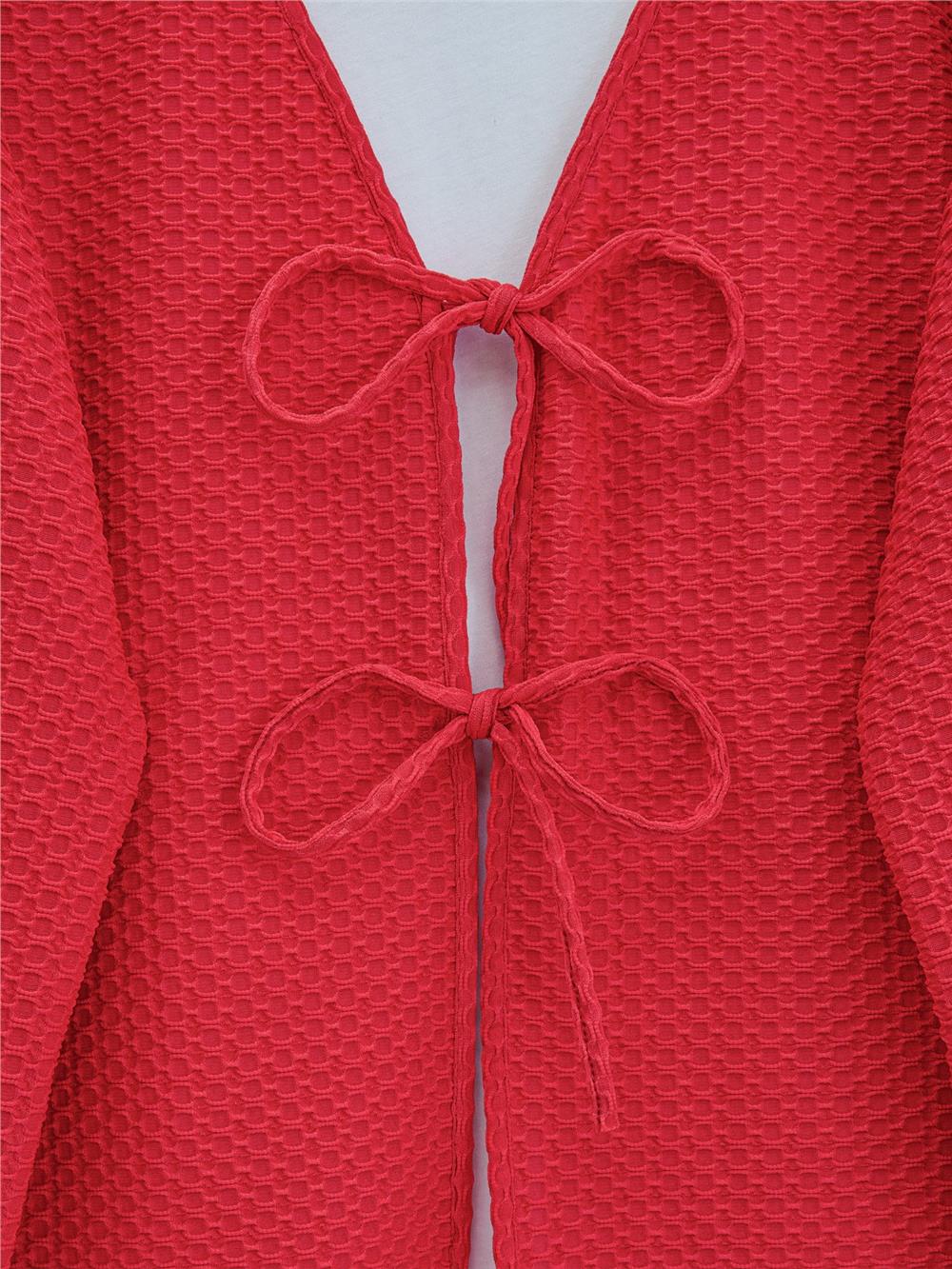 Önü Çift Bağcıklı Petek Desen Kimono -Kırmızı (307-2373-R33)
