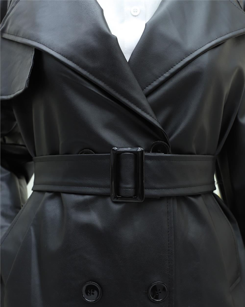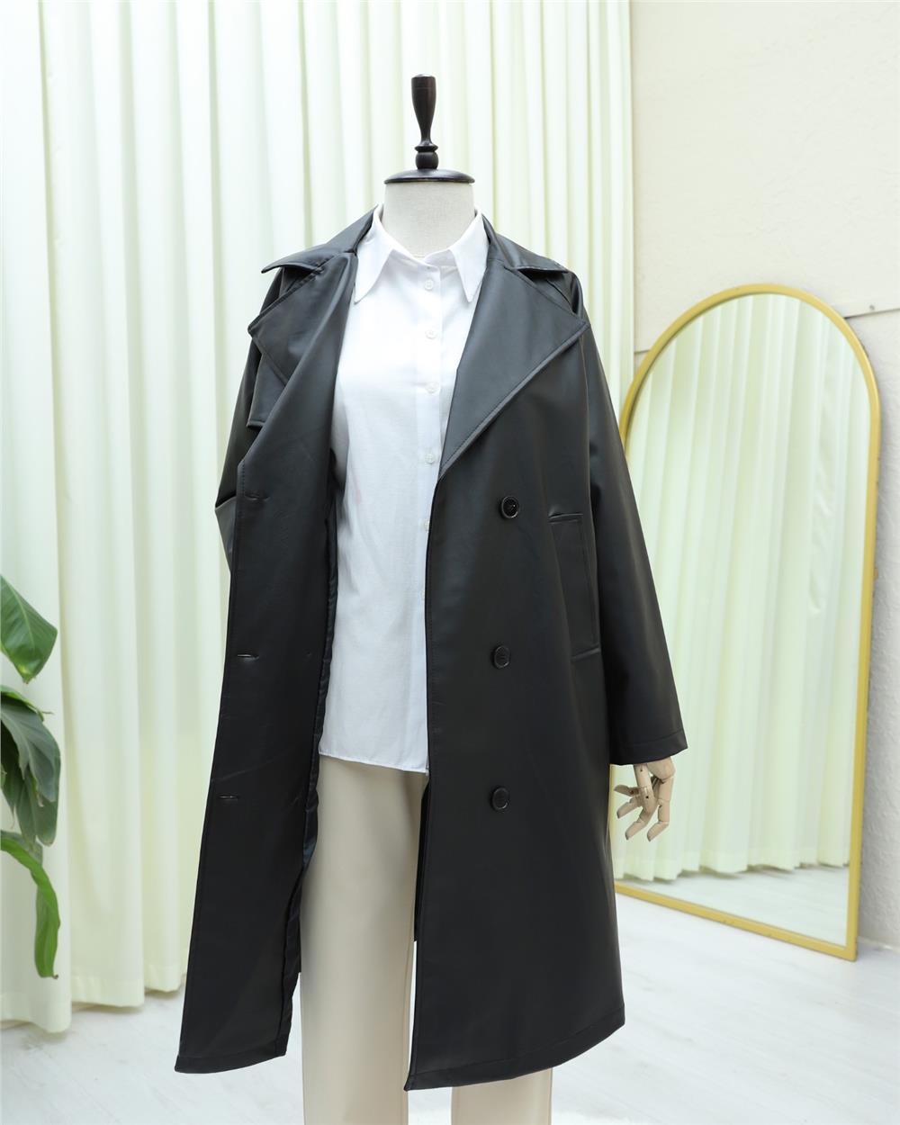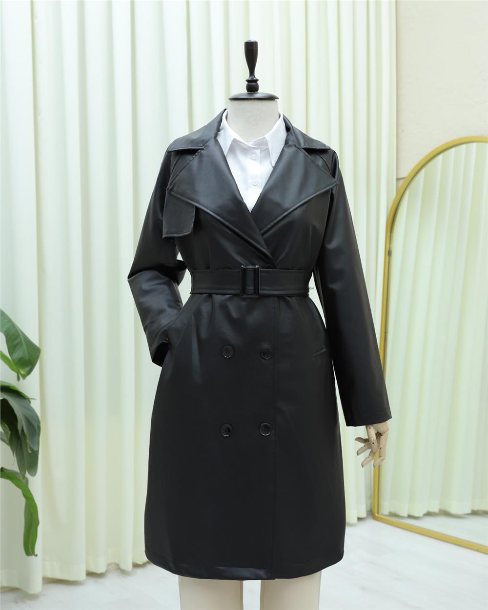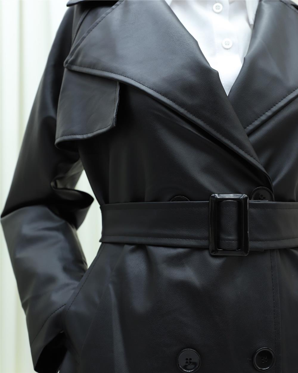 Önü Düğmeli Kemerli Astarlı Deri Pardesü -Siyah (348-2246-R01)