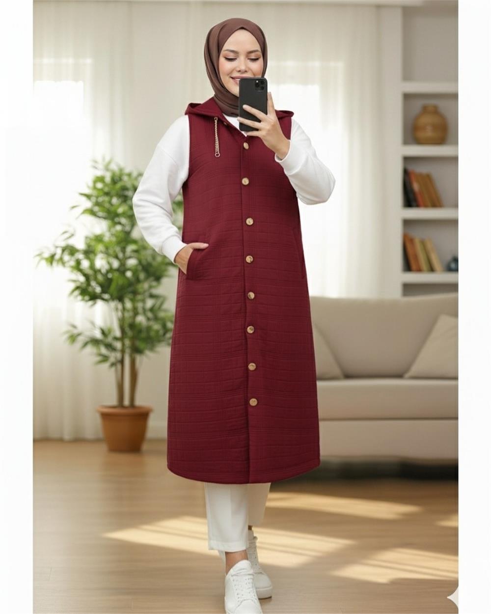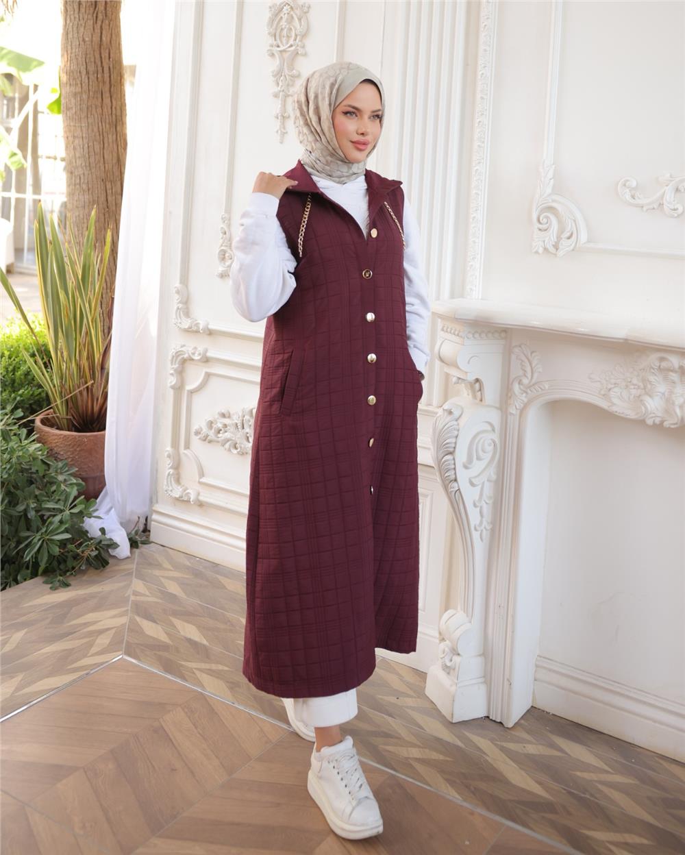 Önü Düğmeli Zincir Detaylı Kapşonlu Kapitone Yelek -Bordo (332-71195-R04)