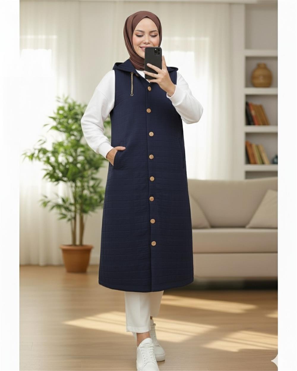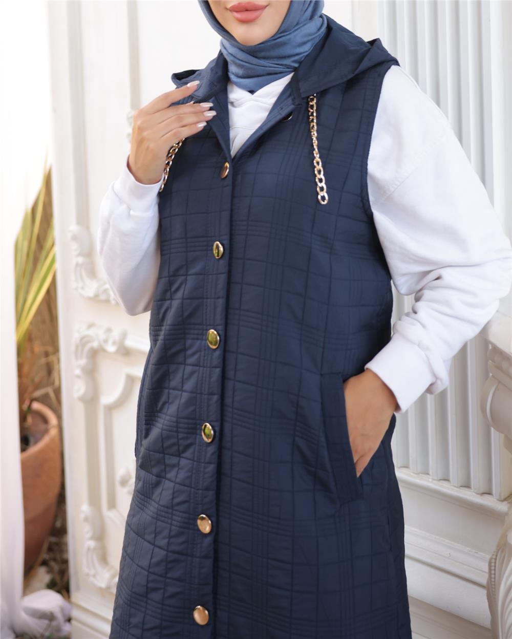 Önü Düğmeli Zincir Detaylı Kapşonlu Kapitone Yelek -Laci (332-71195-R03)
