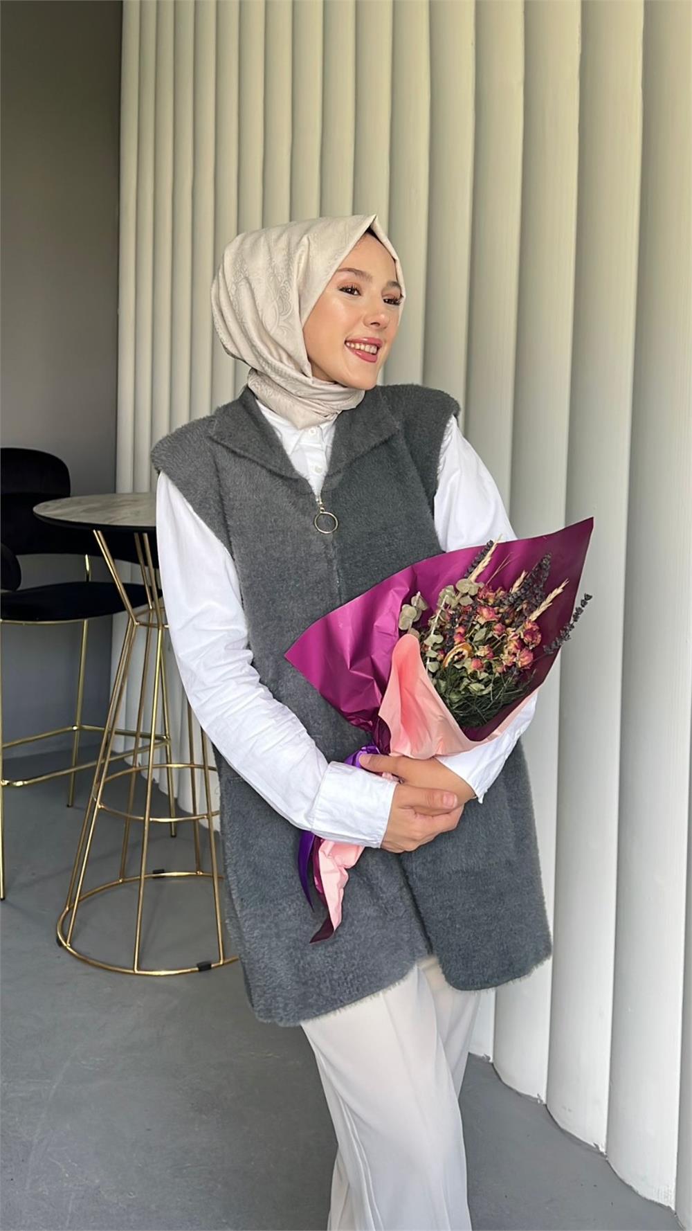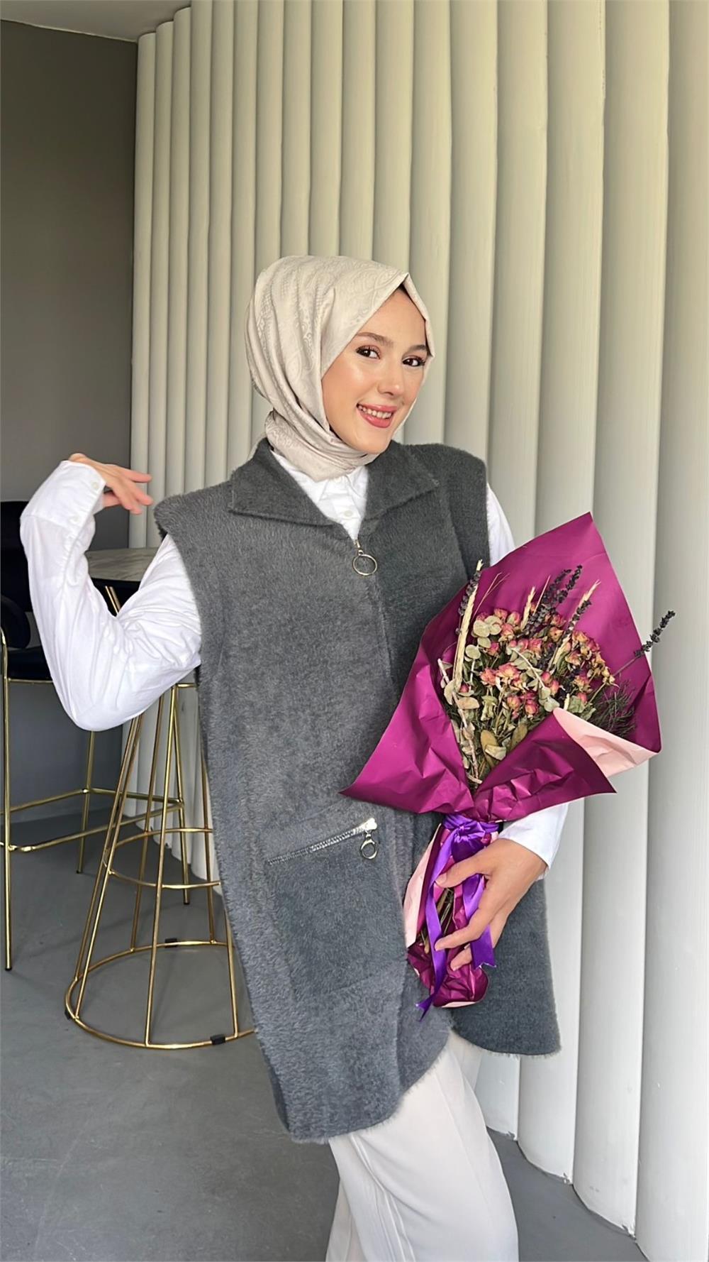 Önü Fermuarlı Torba Cepli Sakallı Yelek -Füme (144-735-R18)