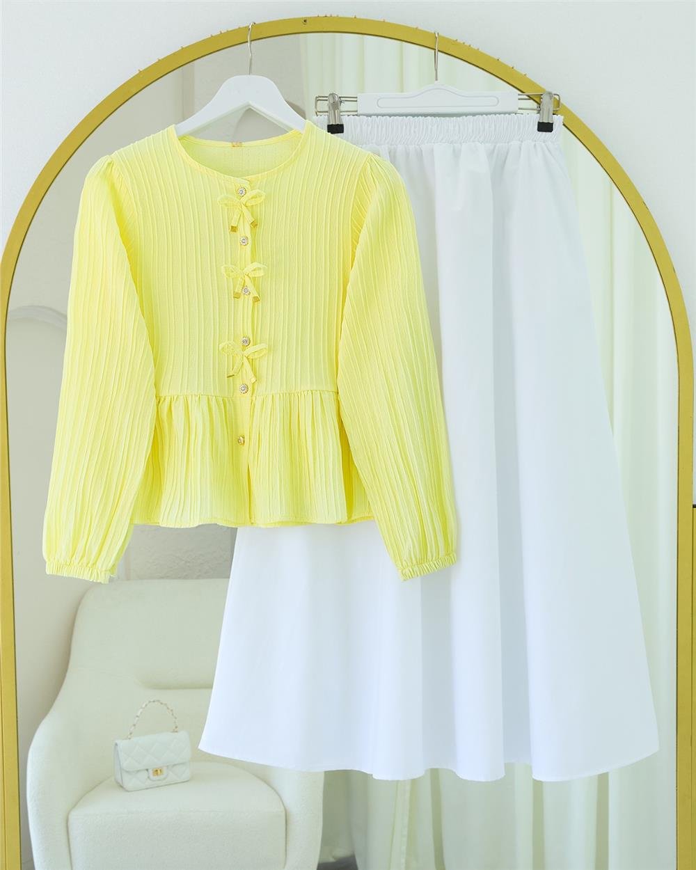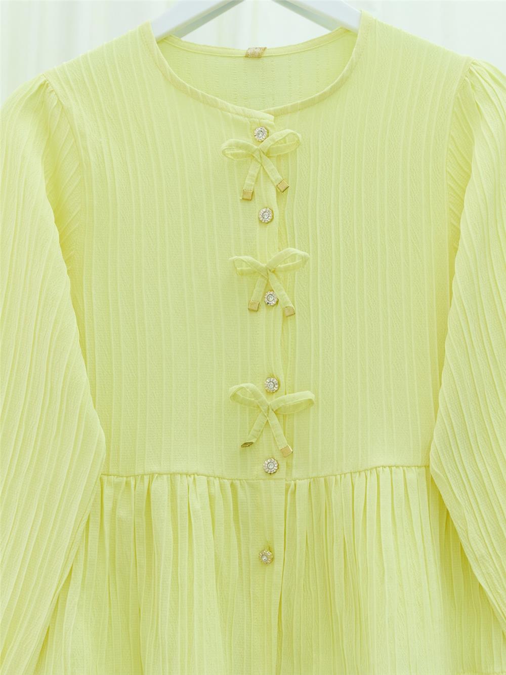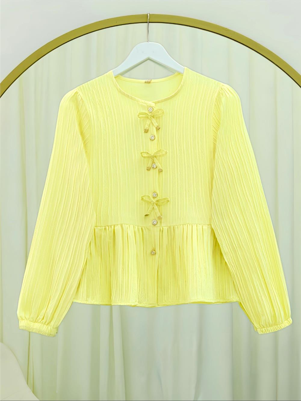 Önü Fiyonk Detaylı Düğmeli Kolu Lastikli Bluz -Açık Sarı (398-1043-R75)