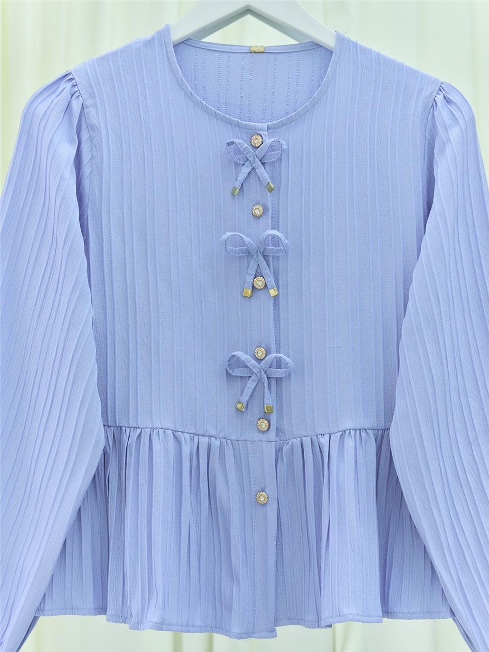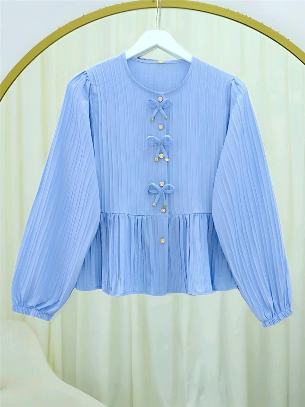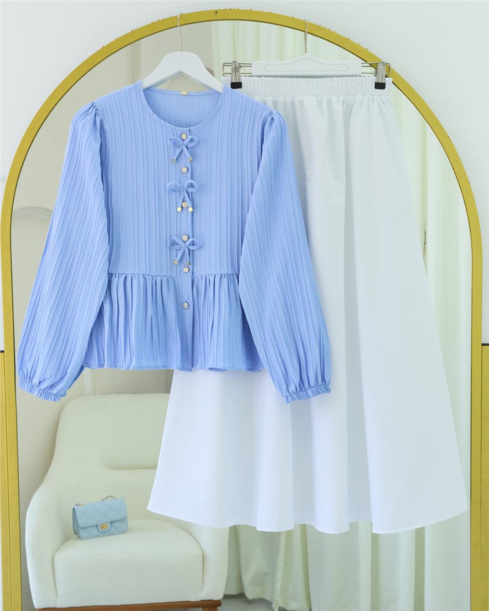 Önü Fiyonk Detaylı Düğmeli Kolu Lastikli Bluz -Mavi (398-1043-R31)
