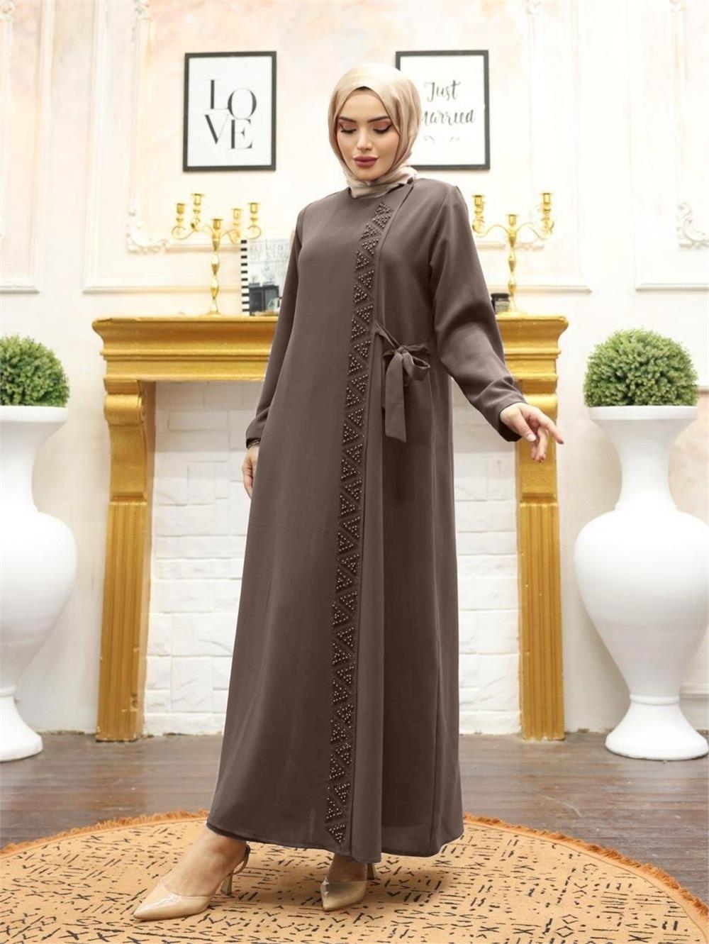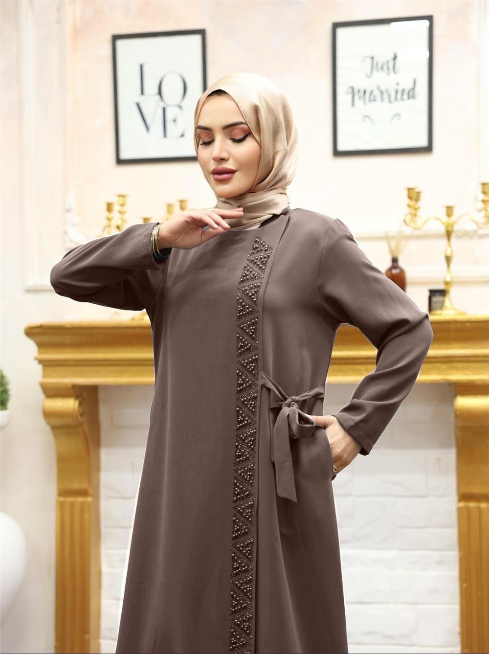 Önü Taş Detaylı Çift Kat Yandan Bağlamalı Ferace -Kahve (412-2004-R15)