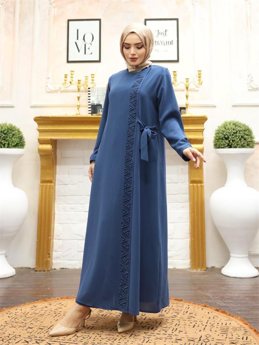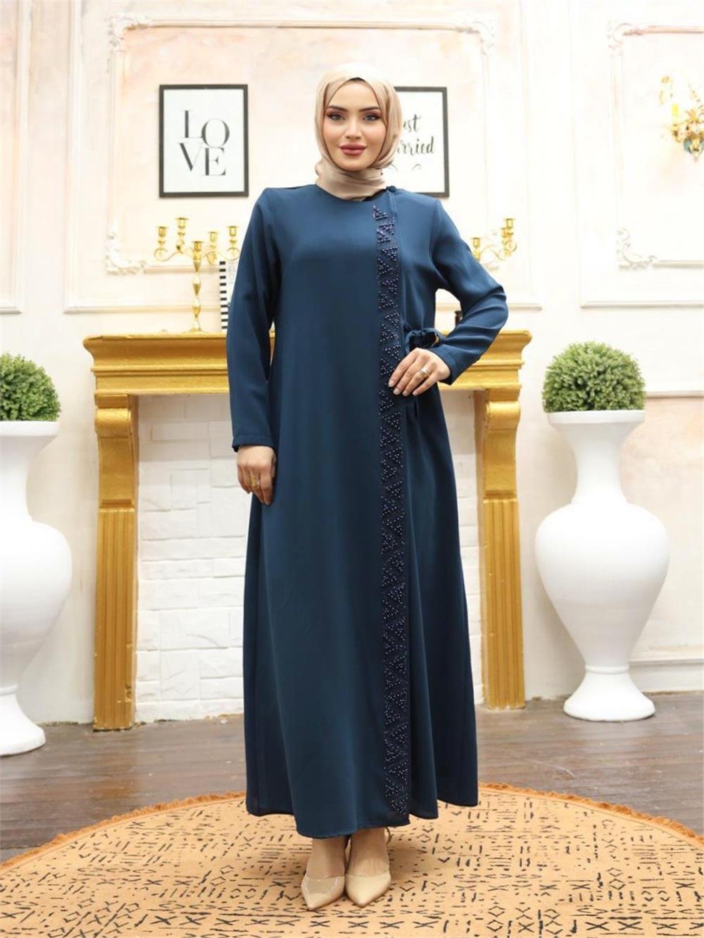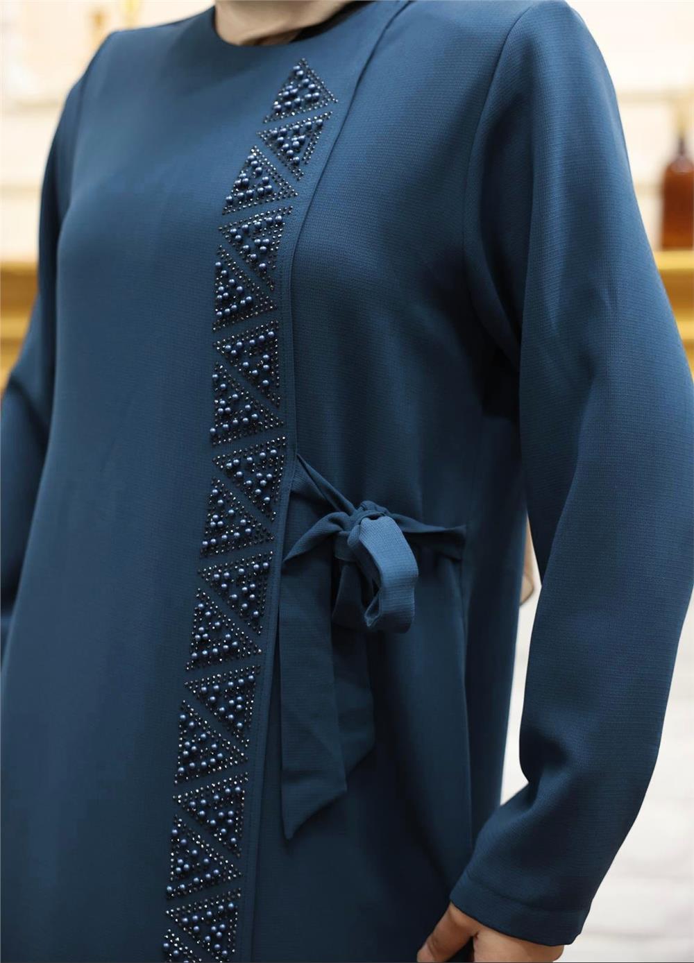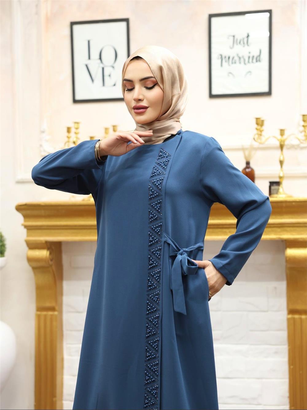 Önü Taş Detaylı Çift Kat Yandan Bağlamalı Ferace -Petrol (412-2004-R29)