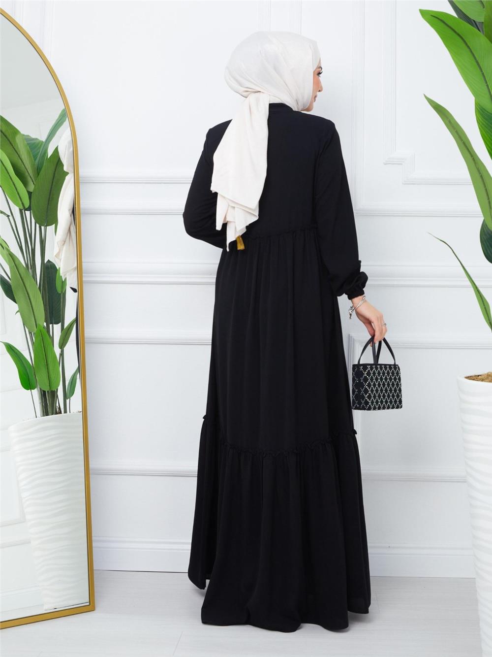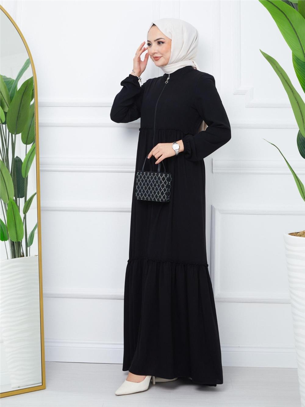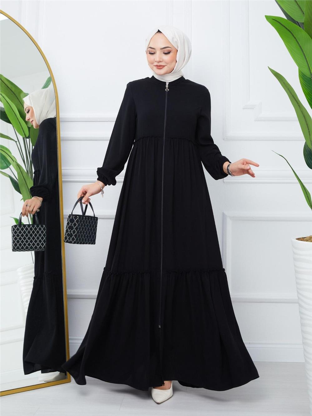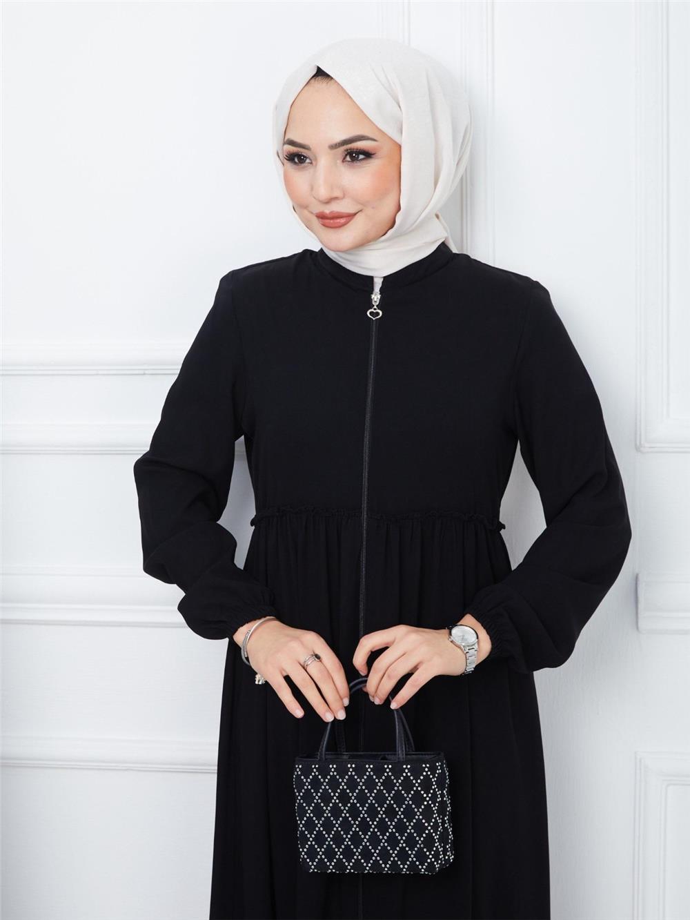 Parçalı Kolu Lastikli Boydan Fermuarlı Ferace -Siyah (412-3000-R01)